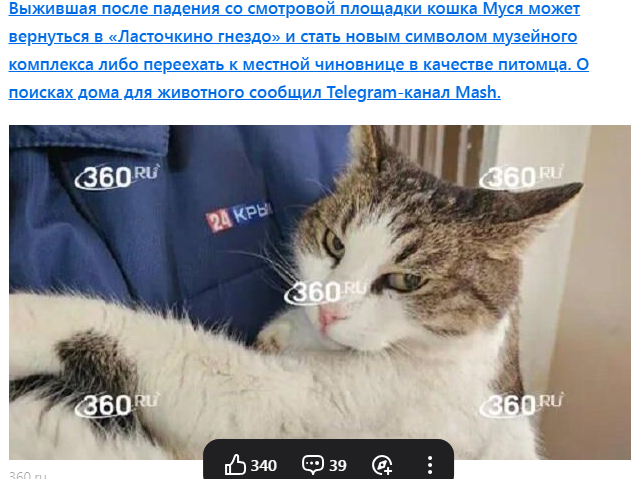 Автор: Дуб МясоедВ честь Муси будут выпущены сувениры. А ее хозяйкой станет... Ну кто бы спорил? - местная чиновница - мэр Ялты Янина Павленко. Сотрудники "Ласточкина гнезда" сражаются молча - они публикуют фото. Но что они могут против чиновницы? Так вот почему Зеленые так визжали... Единственное, что может спасти кошечку - общественное мнение. Чинуше Муся для пиара нужна. Против общественного мнения она не попрет. Но пока сторонники чиновницы имеют 60% голосов. Кстати, именно она и проводит опрос в своем телеграмм канале. Теперь понятно, почему вопросы составлены некорректно. И тем не менее, я не сомневаюсь: судьбу Муси решит результат опроса. Не настолько ей эта кошка нужна, что б переть против общественного мнения.