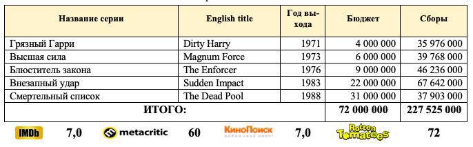 Фильм сделал большие кассовые сборы, которые выглядят внушительно даже в наши времена. Соответственно, тему эксплуатировали по полной и сняли ещё несколько сиквелов. Интересно, что на момент снятия последнего фильма франшизы Клинту Иствуду было уже под шестьдесят лет!