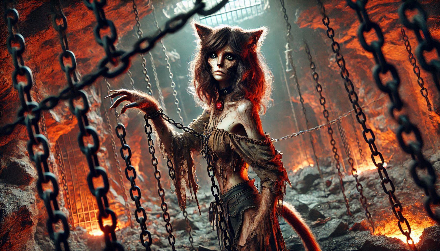 Вот кстати арт, как она выглядела на момент заточения, правда она висела на цепях, а не сидела на полу, но нейронка не всё способна сделать.