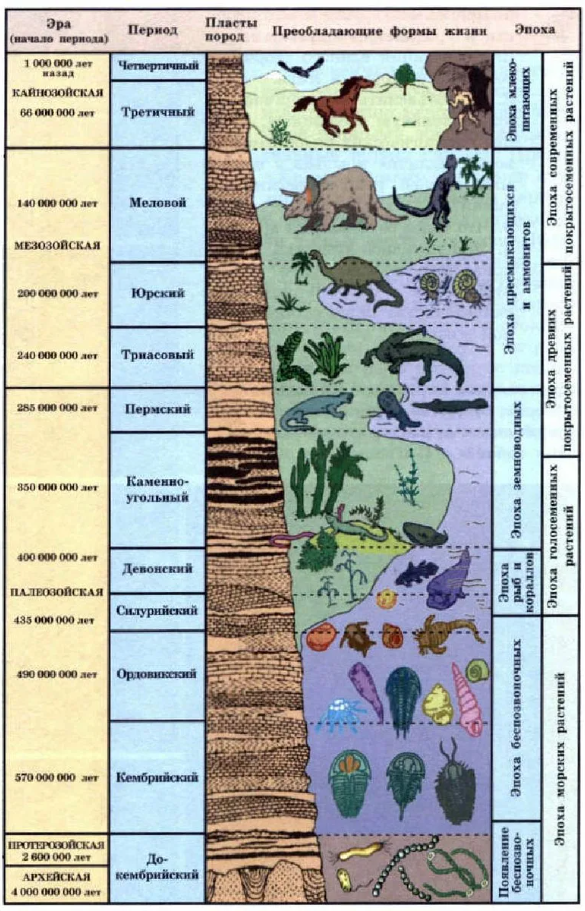 Итак, на картинках изображена так называемая “Геохронологическая таблица” или "колонна", которую вы несомненно видели в учебниках, в популярных статьях, тонких брошюрах и толстых энциклопедиях. Как раз там я её сам впервые нашёл — в каком-то по счёту томе Детской энциклопедии 60-ых годов издания. В общем классный, понятный рисунок, из которого узнаёшь, что там внизу под тобой идут такие слои с мамонтами, динозаврами и трилобитами, чётко разложенными по правильным полочкам. И стразу веришь, ведь нельзя же не верить собственным глазам и невозможно предположить, что взрослые дяди в очках на носах и учёными дипломами в карманах могли бы так грубо и беззастенчиво соврать.