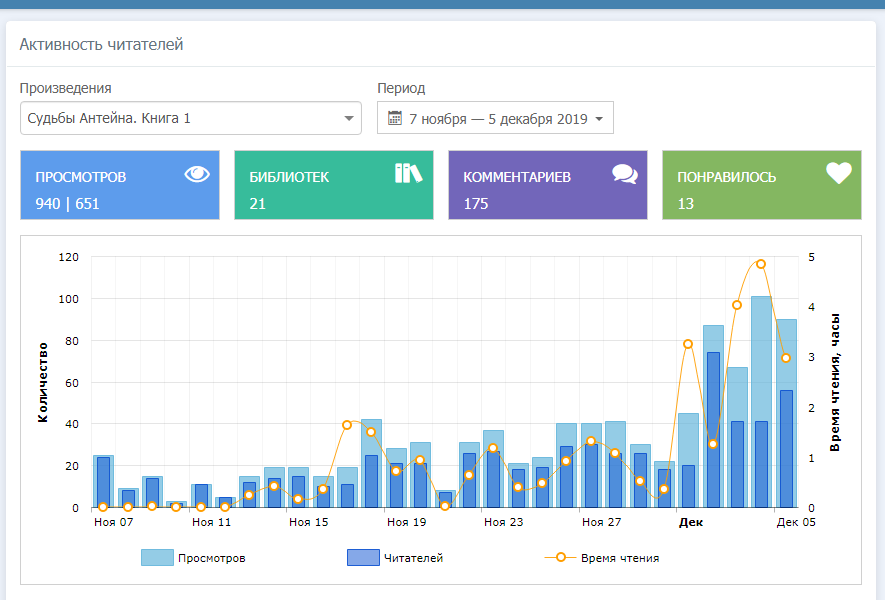 Но! С утра по будням книга меньше висит в виджетах, но больше просмотров. В обед все обедают, по вечерам и ночью все спят, поэтому просмотров мало, но книга может провисеть и пару часов на главной странице. По выходным тишь, да гладь, наверное, тоже все спят. Это мои наблюдения.