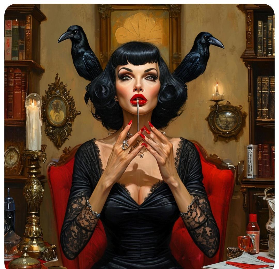 “... в ярком свете перед ними предстала высокая женщина средних лет в черном платье, с ярко накрашенными кровавыми губами, от которых невозможно было оторвать глаз. Она встряхнула головой и ее черные волосы, рассыпались по плечам, будто перья ворона. Ее оголенные пышные руки заканчивались огромными, загнутыми ногтями того же цвета что и губы, похожими на когти, только аккуратно обработанные маникюрной пилочкой. Женщина держала во рту зубочистку, которую языком медленно переводила из одного уголка рта в другой, пока внимательно рассматривала появившихся на ее пороге незнакомых девушек, одна из которых была в шаге от обморока, а вторая усиленно делала вид, что ей все равно…