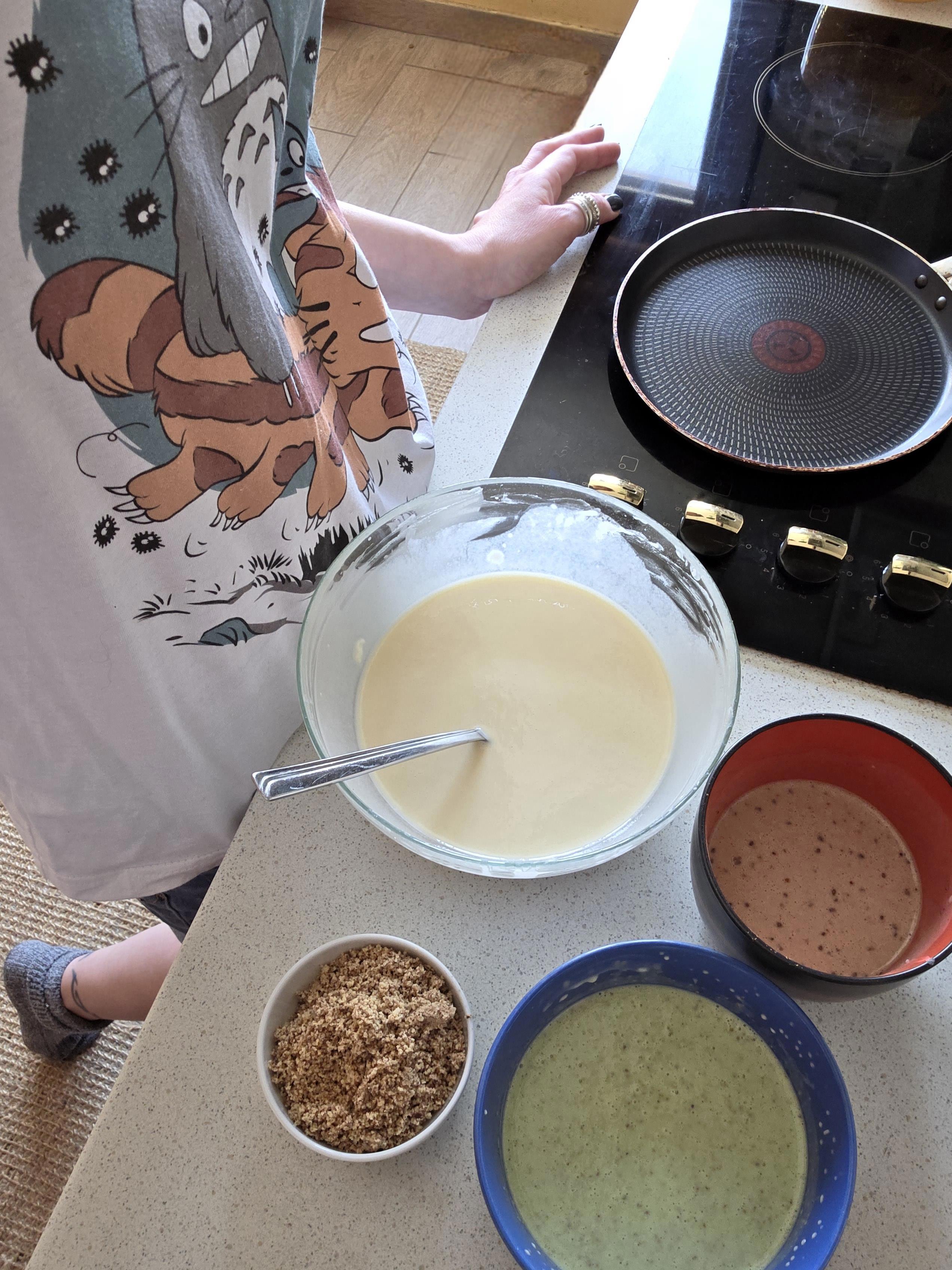 В итоге мы имеем: шоколадные блины (ну тут все просто - с какао), фисташковые и миндальные (благо добрые люди комбайн изобрели), зеленые (вообще не несут в себе смысловой нагрузки, кроме как народ пугать) и апельсиновые, ага, именно они, кстати, самые прикольные и вкусные получились.