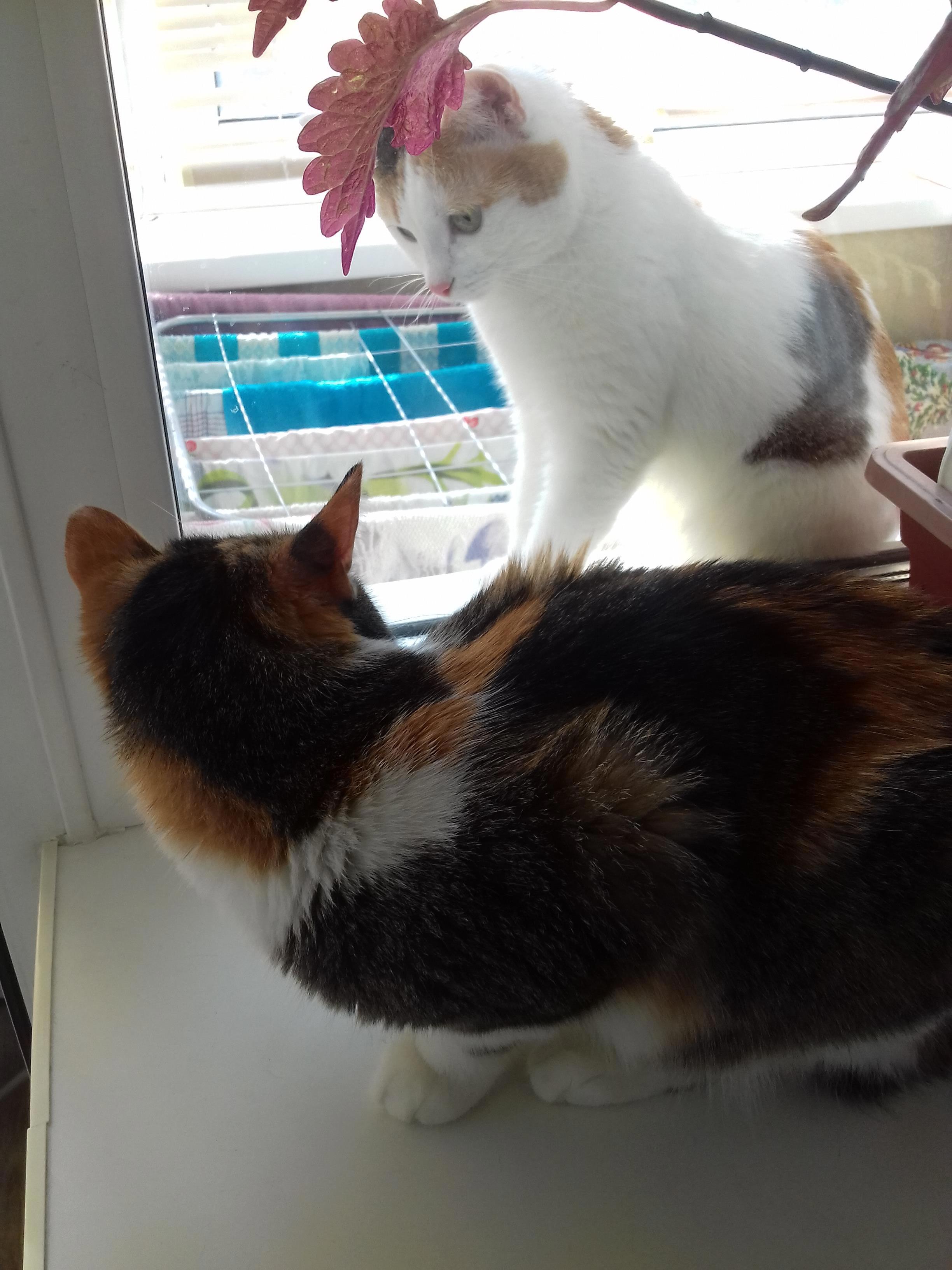 Вот девицы общаются через стекло, так безопасней)) Белокурая ангельская внешность обманчива (но что делать и на ангеле бывают пятна). Темненькая Музка в два раза тяжелее, но рулит хрупкая Апполошка. Впрочем, Муза и сама хороша, цепляет Апполошку исподтишка, а потом смывается.