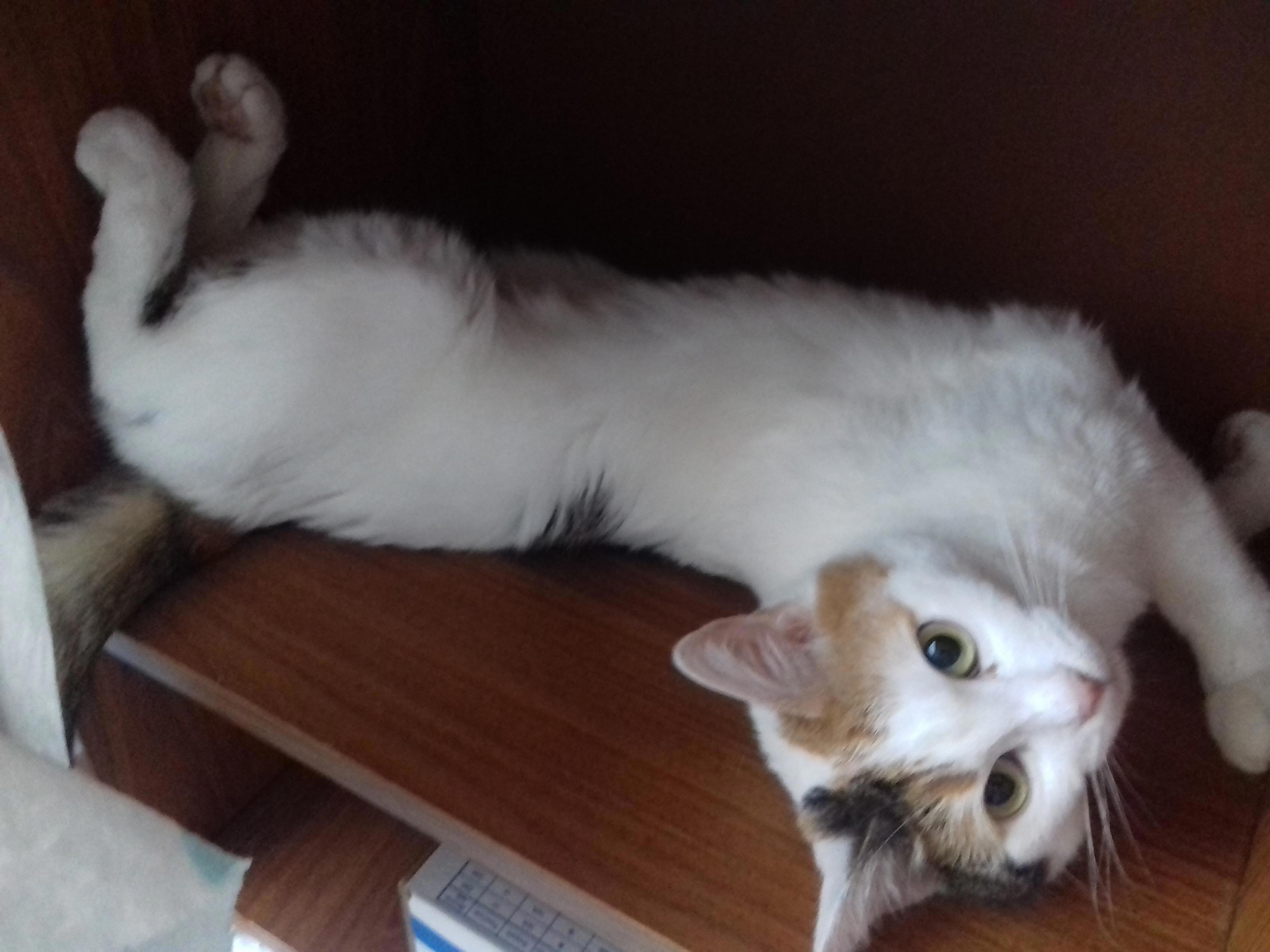 В подъезд ее подкинули с коробкой, которой лежали тряпки и чаплашка с кормом; ночь она пряталась, а на вторую орала под дверью спальни так, что с тех пор двери мы не закрываем даже в ванной. В остальном же это кротчайшее существо на свете, деликатное, изящное и крайне понятливое; за все время совместного проживания это создание не разбило и не попортило ни одной вещи. Ну, почти... Затяжки на шторах в погоне за приблудной мухой (а чо она летает!) и поцарапанные двери не считаются, ибо нефиг закрываться