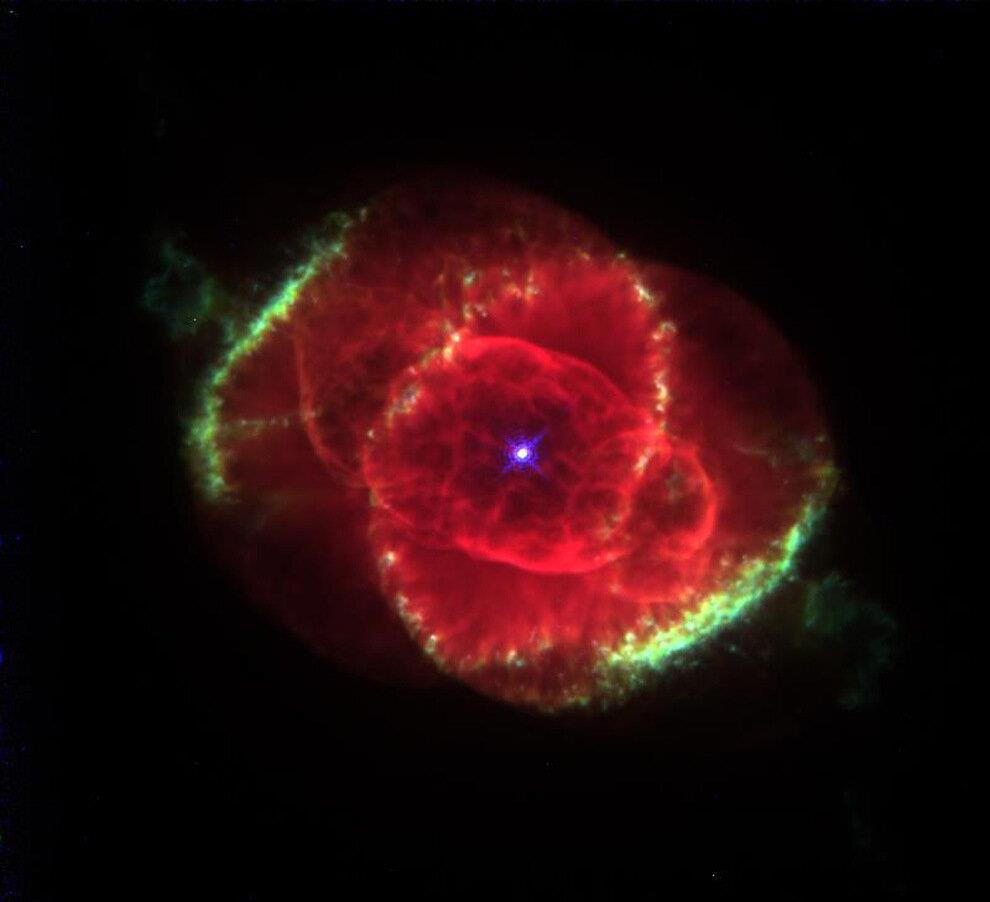 Ну а если посмотреть на уже знакомую нам NGC 6543 не в любительский телескоп, а во что-то серьезное, то и вовсе откроется феерия. Становится ясно, что сбросов оболочки было не два-три, а гораздо больше: