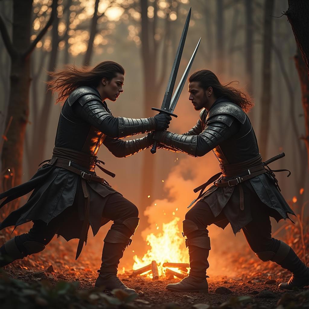 Девлин не заставил себя долго ждать, и через секунду был уже на ногах, а острие его меча кровожадно отражало отблески костра. Противники закружились в смертельном танце. Мы с Диком, как завороженные уставились на них. Меч Роланда, описав дугу, встретился с клинком Девлина. Противники сошлись в ближнем бою, между ними были только их скрещенные клинки. Танец смерти продолжался.