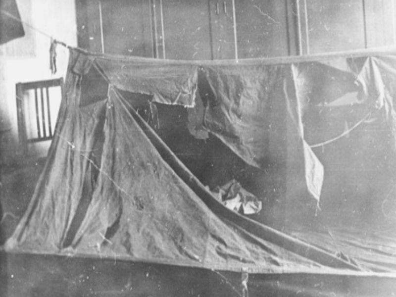 Палатка была разрезана, а в ней находилась часть верхней одежды и обуви туристов, фотоаппараты, фляжка со спиртом. У палатки фонарик (из разных показаний расхождения, работоспособный он был или нет). В ходе следствия было установлено, что разрезы в палатке были сделаны изнутри. Вот палатка в кабинете следователя.