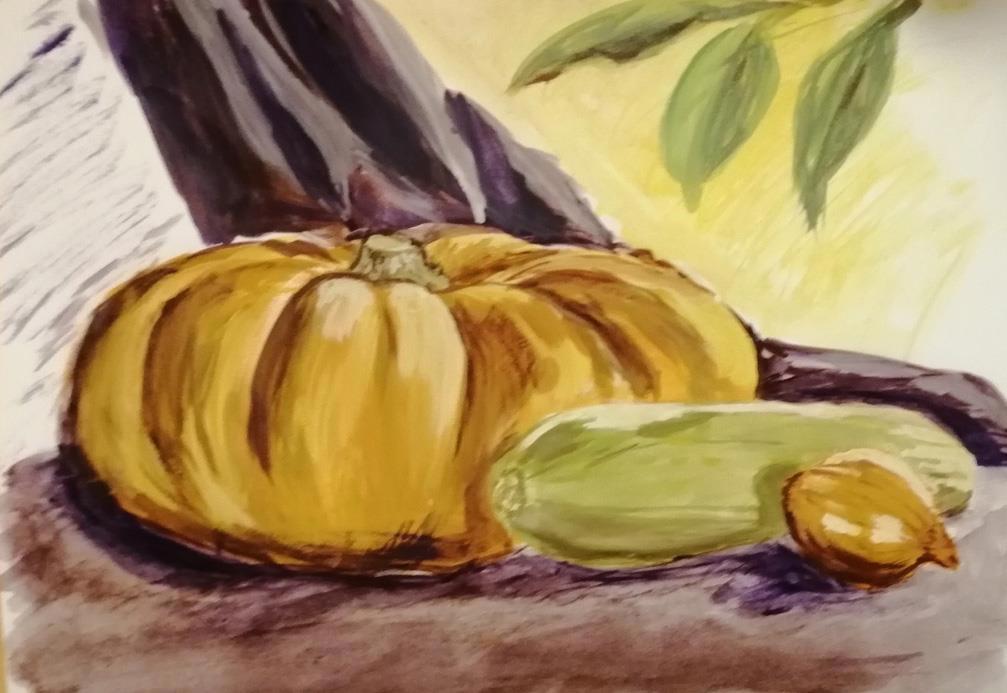 Ах, какая тыква была красавица! Золотистая, приплюснутая, ребристая - она так и просилась на натюрморт. Для компании я взяла маленький кабачок, купленный на салат, и головку лука.
