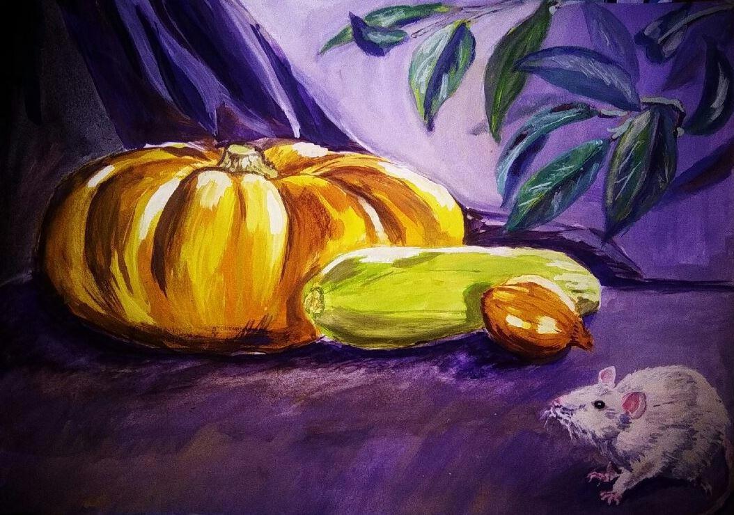 Показала работу в художественной студии. За фон поругали, за тыкву похвалили и попросили дорисовать белого мыша, чтобы можно было отправить на новогоднюю выставку. Мышей я не держу, потому крыску честно срисовала с фото – с небольшими изменениями.