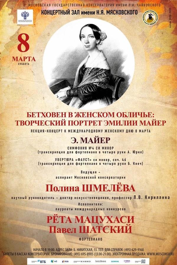 1. Полина Шмелёва, организатор концерта - моя аспирантка (впрочем, на афише это указано). Тему мы выбрали еще в процессе написания дипломной работы: творчество Эмилии Майер. Сейчас Полина потихоньку пишет диссертацию.
