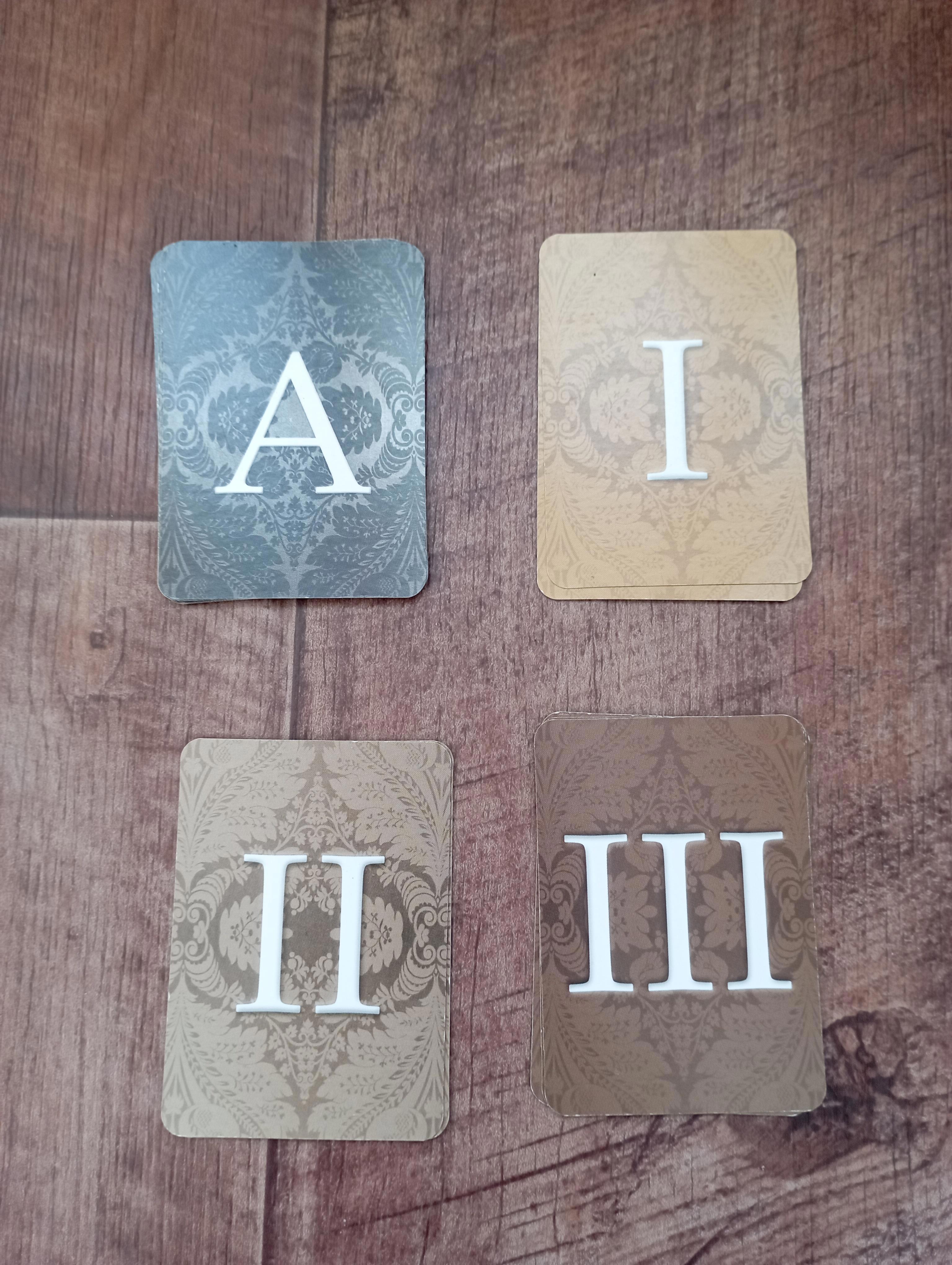 А ещё у нас есть четыре колоды персонажей. Карты с буквами на рубашке — предки, а остальные (соответственно римской цифре) — персонажи первой, второй и третьей эпох.