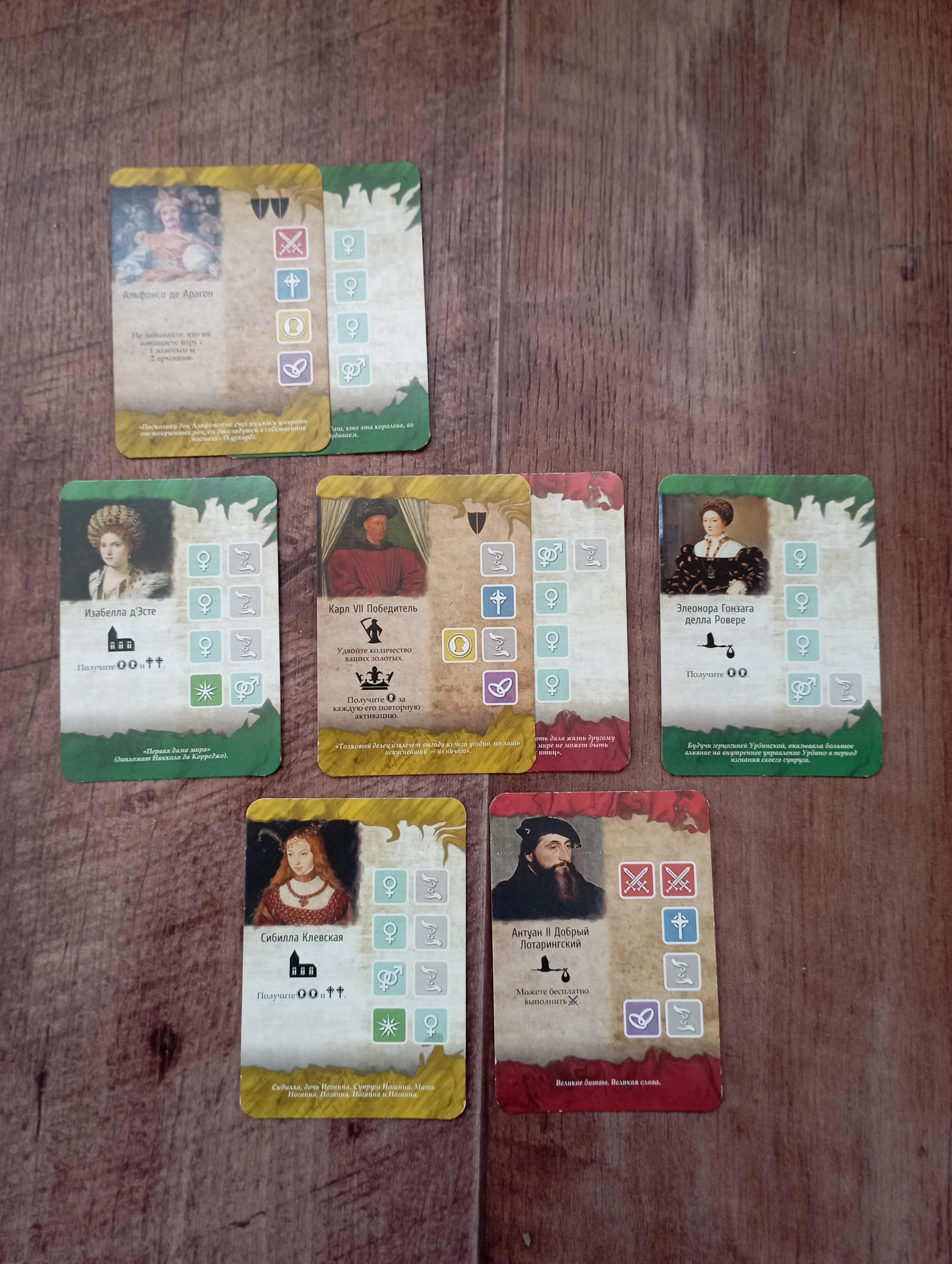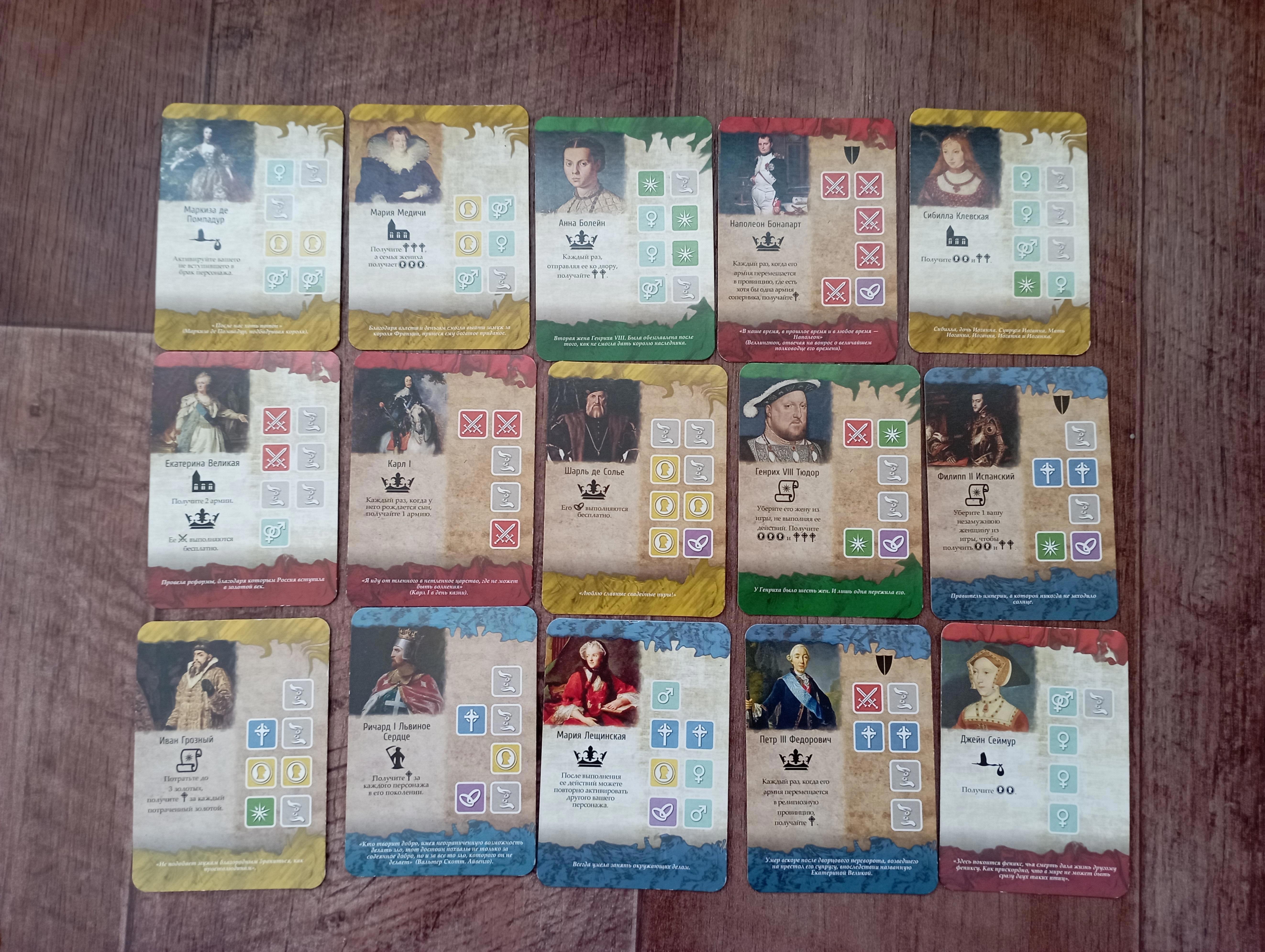 Ну а теперь самое интересное! Кто же у нас персонажи?! А это реальные исторические лица из европейской аристократии! На картах их настоящие, невыдуманные портреты, а фразу внизу этот человек когда-то говорил (ну, или она ему приписывается), или это художественный текст для атмосферы. Даже цветовой атрибут карты более-менее соответствует тому, чем знаменит в истории этот человек: