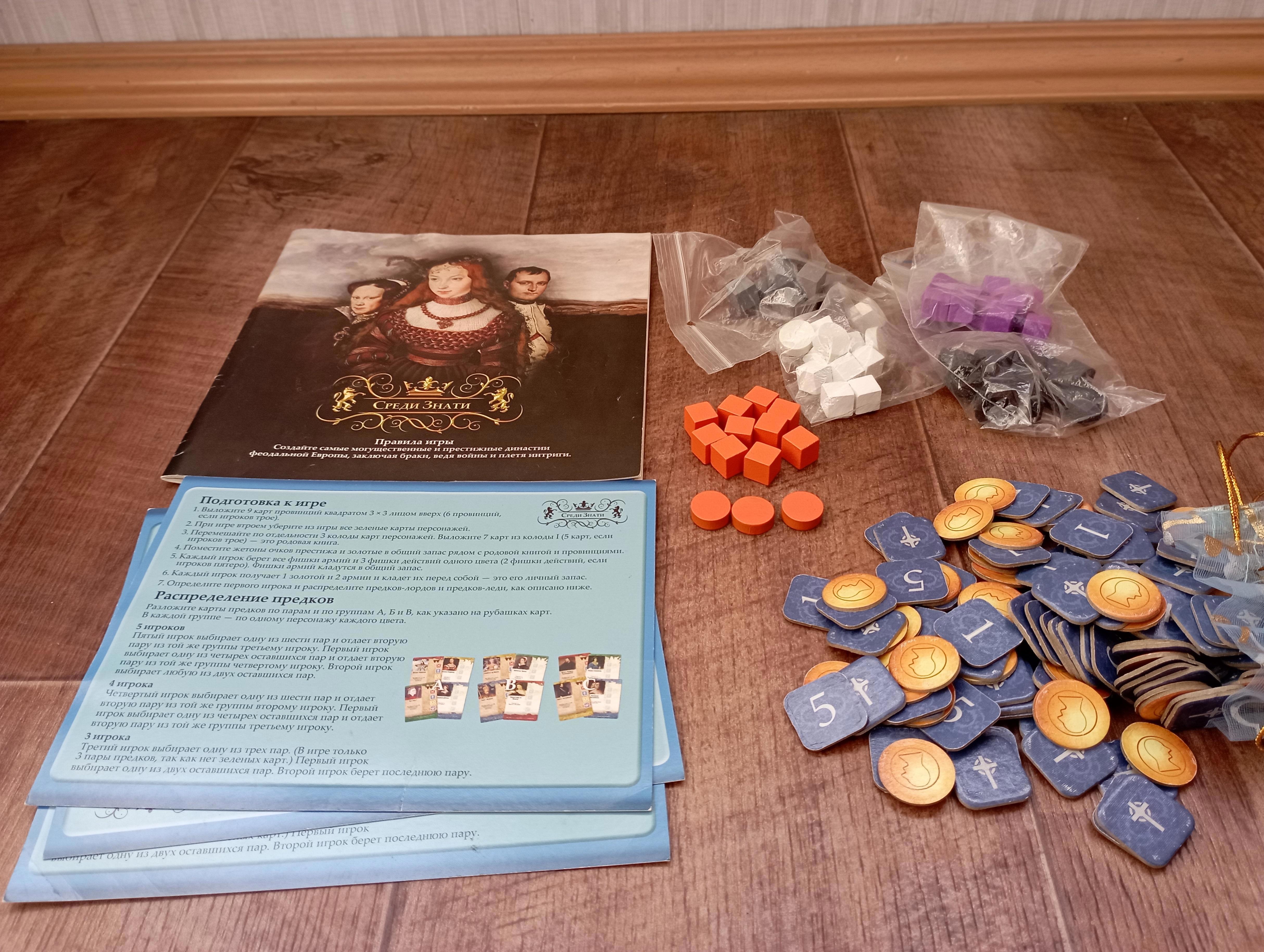"Среди знати" — точно игра не для новичков в настолках; точно не для тех, кто хочет простой игры без возни с правилами; точно не для случайно собравшихся и мало сыгранных компаний. И для пар, которым некого позвать третьим, тоже не подойдёт.