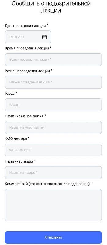 Автор: ОченьтихийлогистНа сайте Российского общества "Знание" появилась форма для доносов на лекторов, мероприятия с которыми вызвали у истинно патриотически настроенного россиянина подозрения