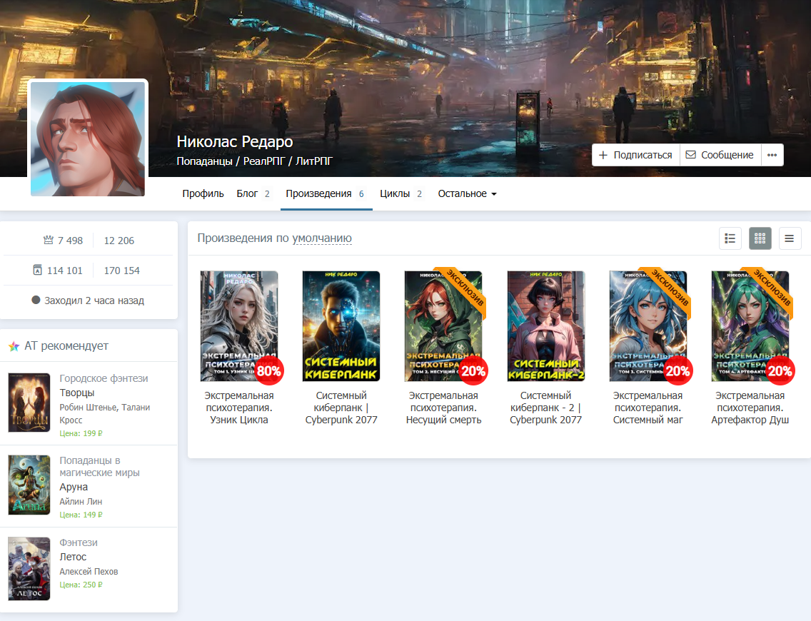 Ссылка для всех заинтересованных: https://author.today/u/nikredarrow/works?view=list&sorting=default