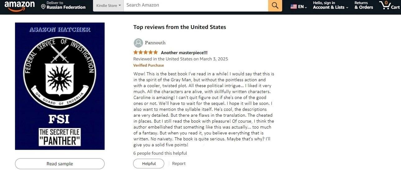 Автор: Игорь ХэтчерПривет всем! Хочу поделиться с вами отзывом на мою книгу "Секретный файл "Пантера", что в английской версии продаётся на Амазон. Не так давно я публиковал, что ей повысили цену, а теперь ей даже написали отзыв, который кстати совсем недавно опубликовали. Прикладываю скрин.