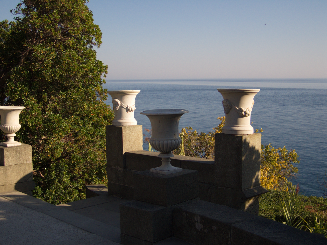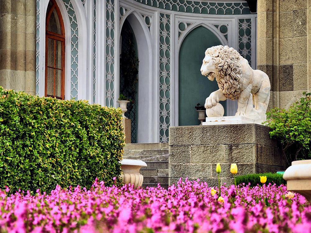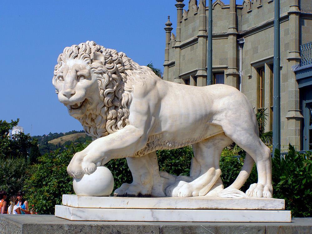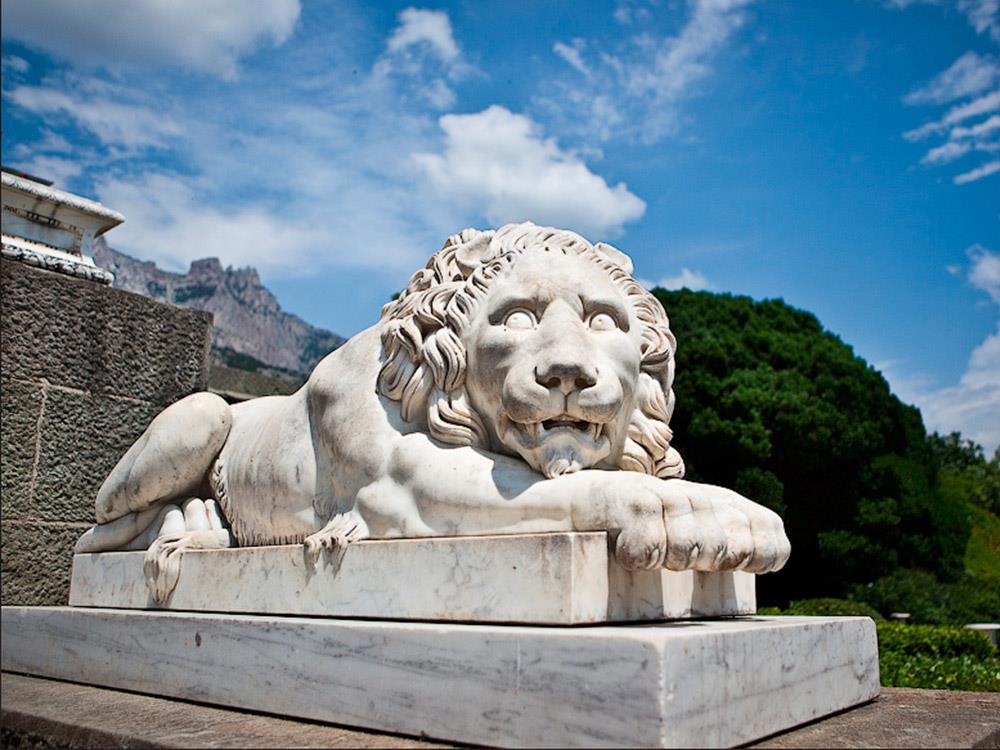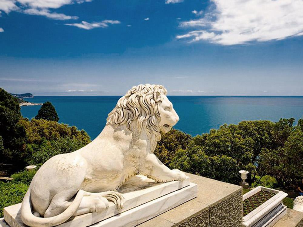Терраса плавно спускается к морю, а по обоим сторонам её охраняют три пары белоснежных мраморных львов работы итальянского мастера Джованни Бонанни.