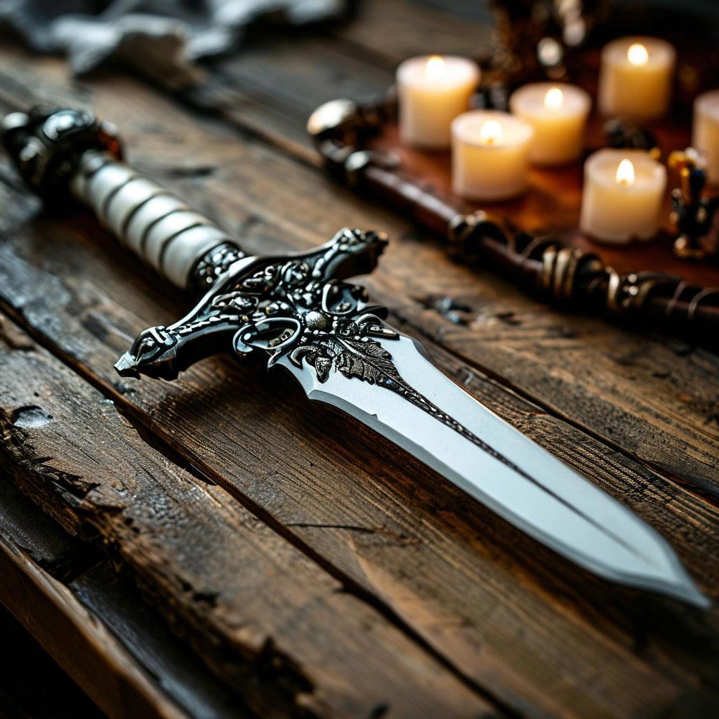 Гном вернулся, держа в руках кусок веревки и длинный кинжал с белой рукоятью, и положил на стол рядом с гостьей: