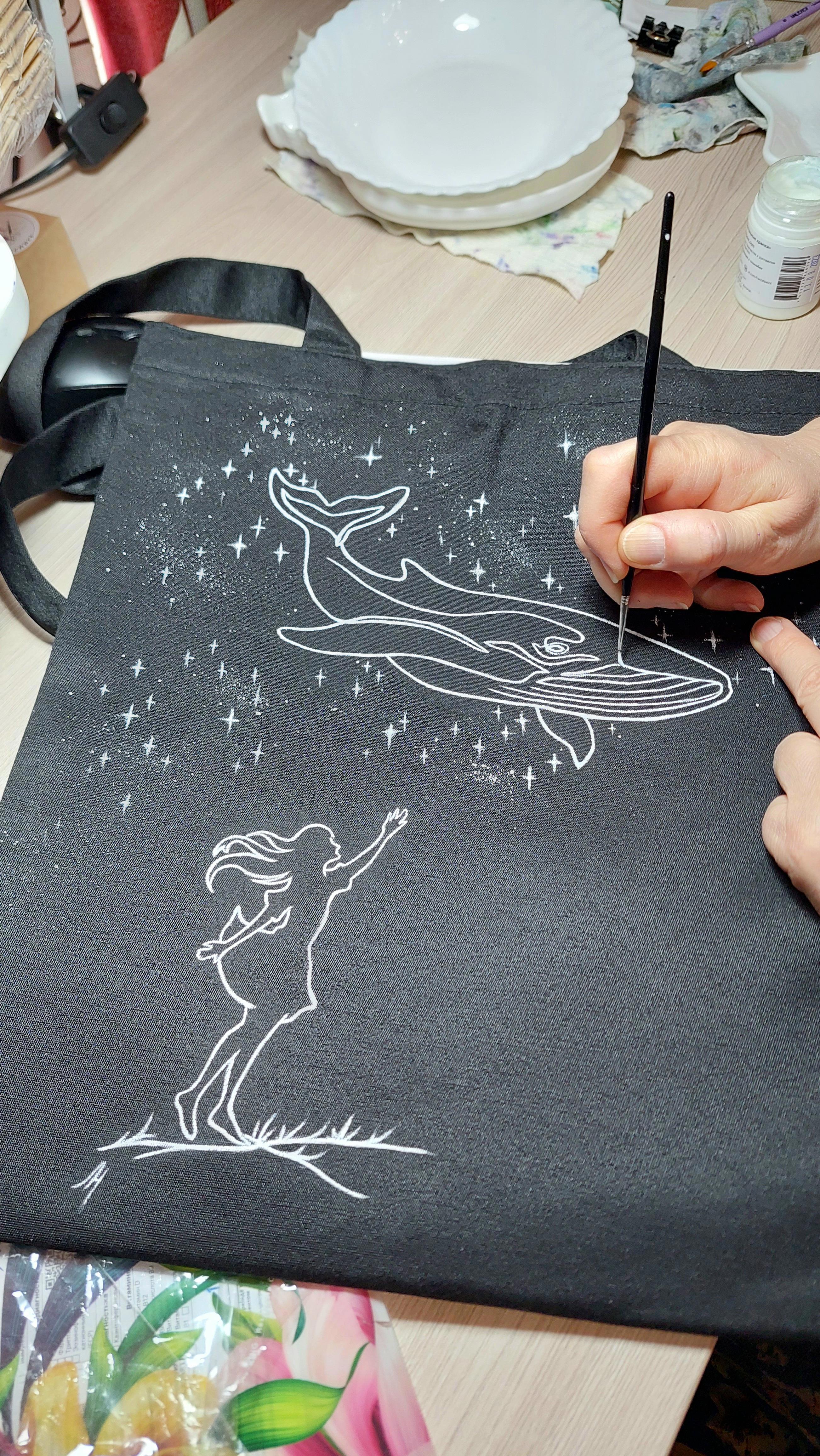 - Смотри, блин, белые лини пожелтели, рисунок стал убогим, как такое дарить. – Жалуется хозяйка. Она, по просьбе хозяина, на скорую руку сделала пару шопперов для подарка к 8 марта.