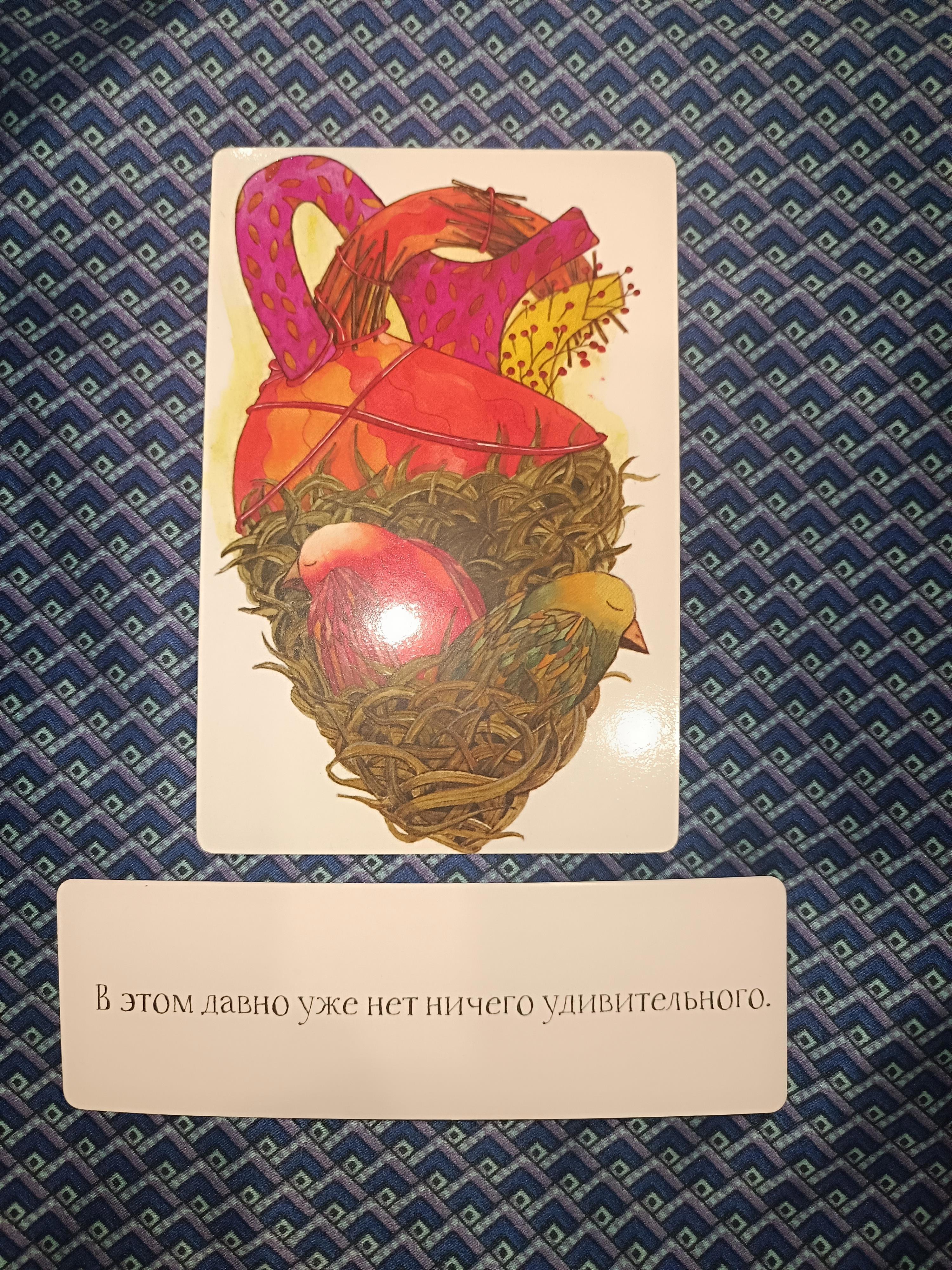— Да, ещё и погодка располагает к волнениям, понимаю. Тогда давайте закончим беседу при свечах красиво, — Ари ставит бокал на столик и достаёт колоду любимых метафорических карт. — Хочется посмотреть, что они скажут о вашей книге.