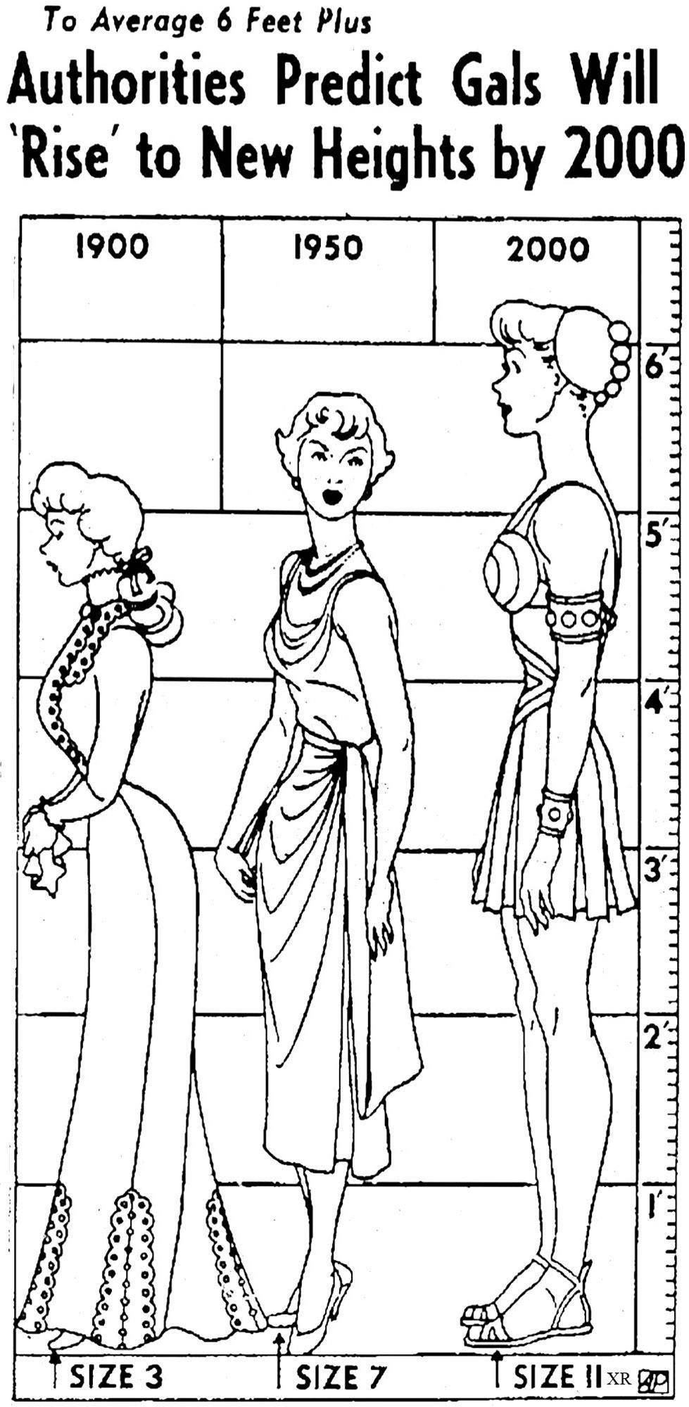 Автор: Алекс РусскихВ 1950-м году ученые сделали вывод - средний рост женщины к 2000-м году будет примерно 190 см. Это было неопровержимо доказано исходя из тенденции к увеличению роста, произошедшей с 1900 по 1950 гг. Но что-то (как и всегда) пошло не так. Человечество в очередной раз сыграло в "натяни нос пророку), а женщины не стали все, как одна баскетболистками.