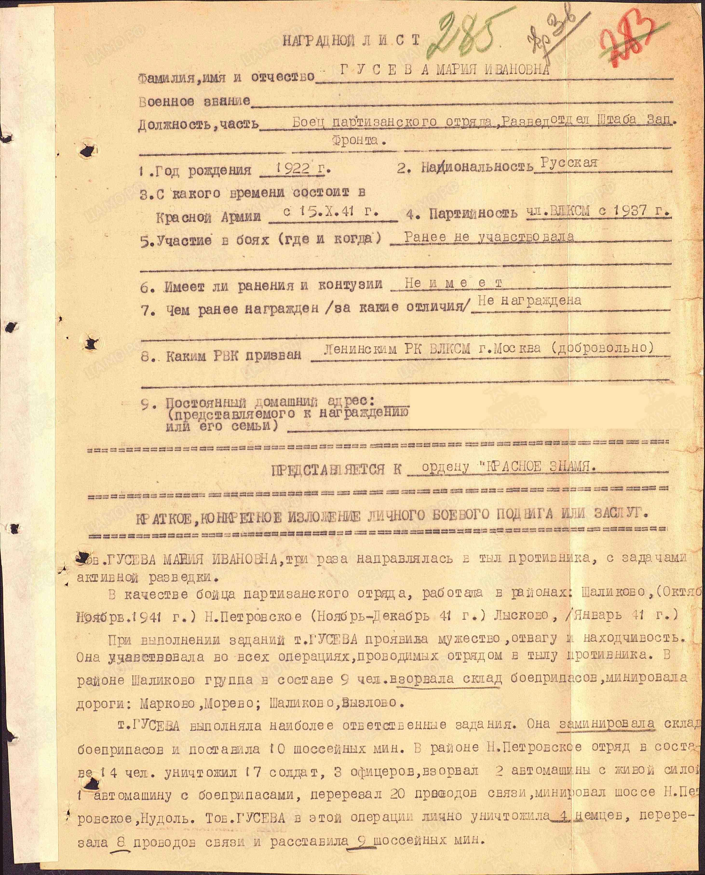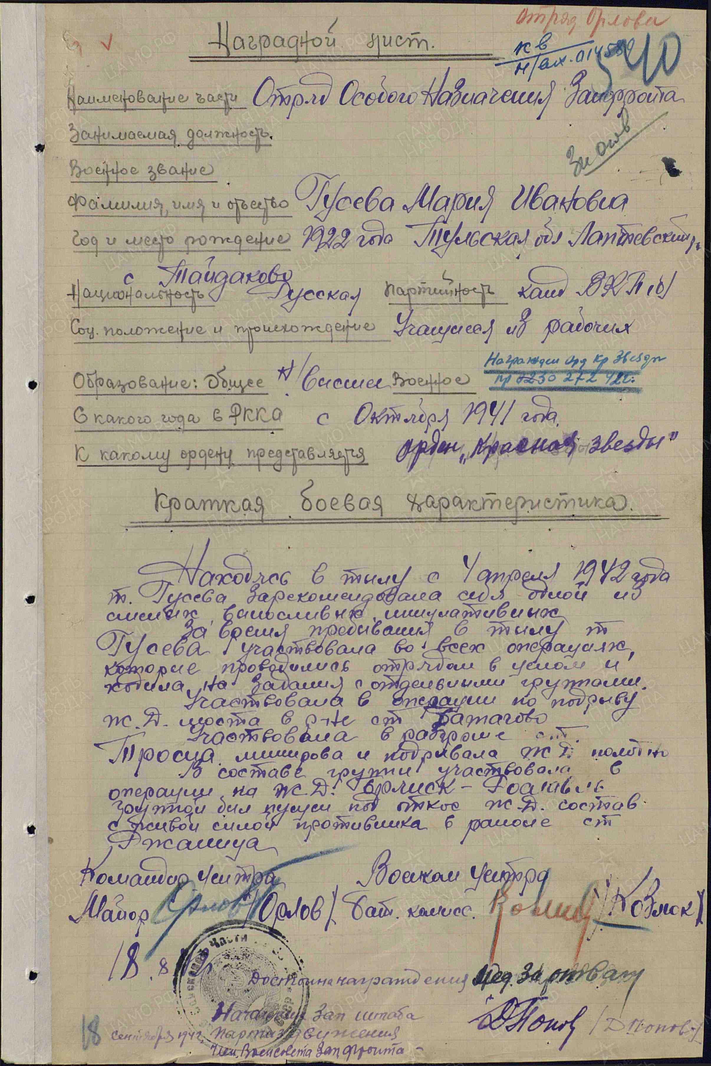 Перешедшая на третий курс студентка Института стали Мария Гусева отбор прошла - помогли незаконченное высшее образование и несколько спортивных разрядов. 15 октября она в составе первой группы будущих диверсантов — около сотни юношей и девушек — прибыла на базу в/ч 9903, которая располагалась тогда у железнодорожной станции Жаворонки в километрах 30 к западу от Москвы.
