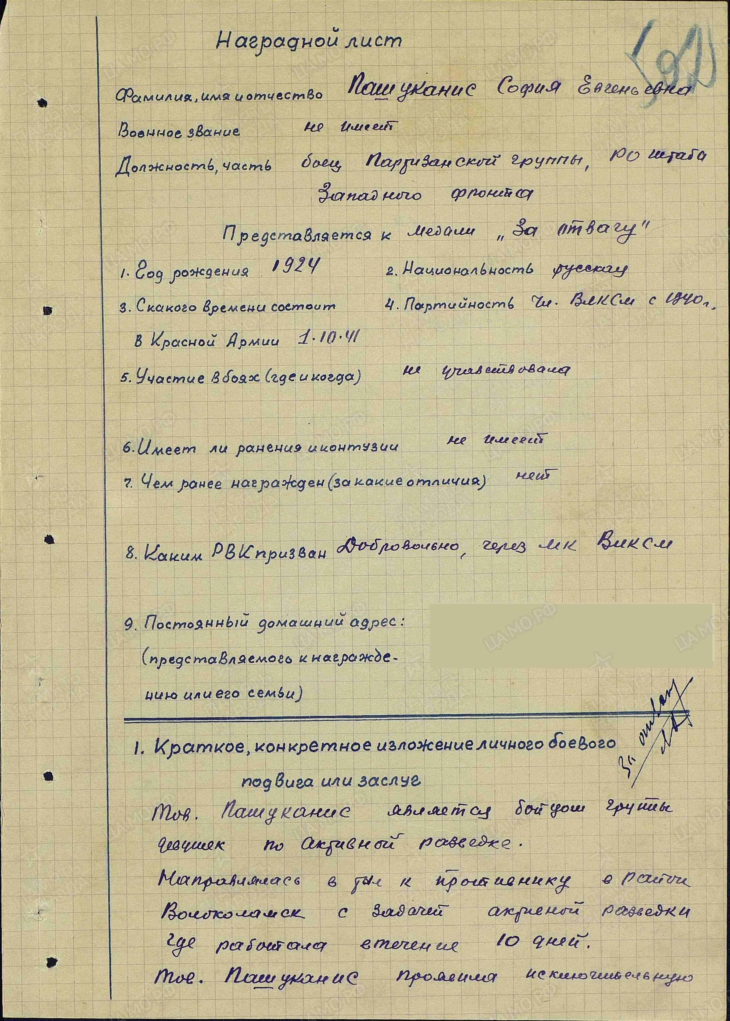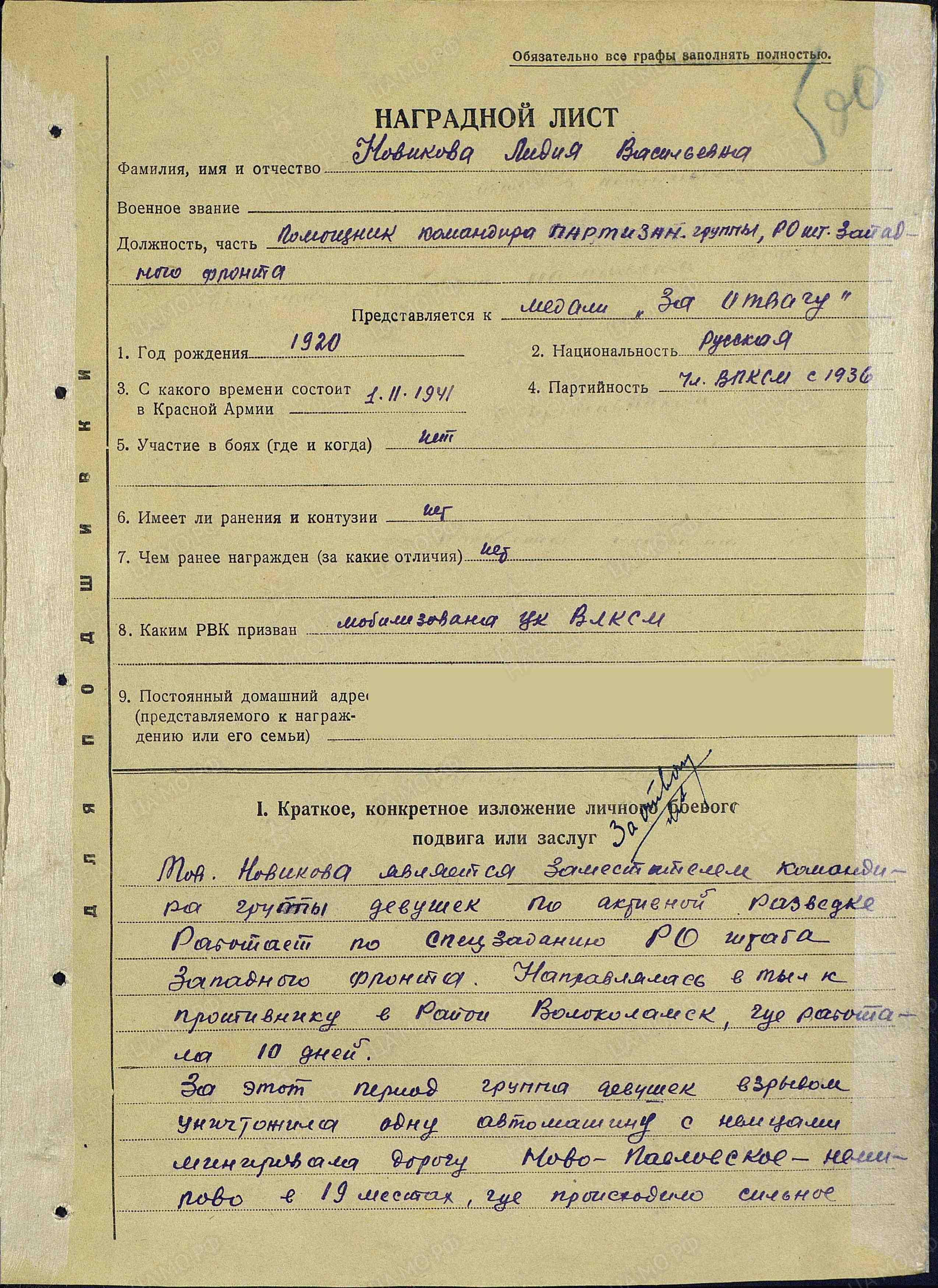 Медаль "За отвагу" она получила за десятидневный рейд по тылам противника в районе Волоколамска, в ходе которого лично уничтожила трех фашистов.