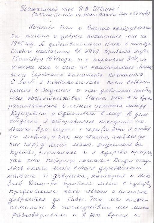 Я была дважды у вас в музее - один раз, когда открывали обелиск, и я возлагала венок к его подножию, другой раз просто потянуло побывать там, т. к. я нигде не выступаю о Зое. Видите, в боях с ней я не была, а написано о ней не мало и очень подробно".