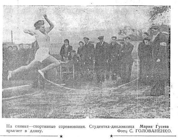 Зато Маша была хорошей спортсменкой, и по этой причине о ней тоже часто писала газета "Сталь". Первое упоминание было вскоре после поступления, в статье "Легкоатлеты открыли летний сезон": "В бежавших затем двух женских командах очень порадовали новички — Иванова (техфак), Гусева (фак. "Г"), Федулова, Лизунова и Борисова (метфак)".