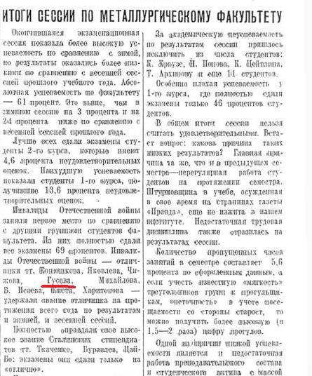 И вновь у "Муси со звездочкой" слова не расходятся с делом. В те годы в институтской газете обязательно писали об итогах сессии. Процитирую один абзац из заметки "Итоги сессии по металлургическому факультету" в газете "Сталь", №27 за 1945 год: