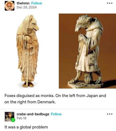 Однако вот фигурка из Японии - Кицуне, прикидывающаяся монахом... И внезапно древняя фигурка лисы-оборотня - но из Дании. И похоже сделана в те времена, когда о Японии там знать не знали.
