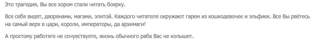 И все эти вниги — читают. Так что далеко не все зацикленны только на дворянах, графах и гаремах. Просто читатели обычно молчаливы.