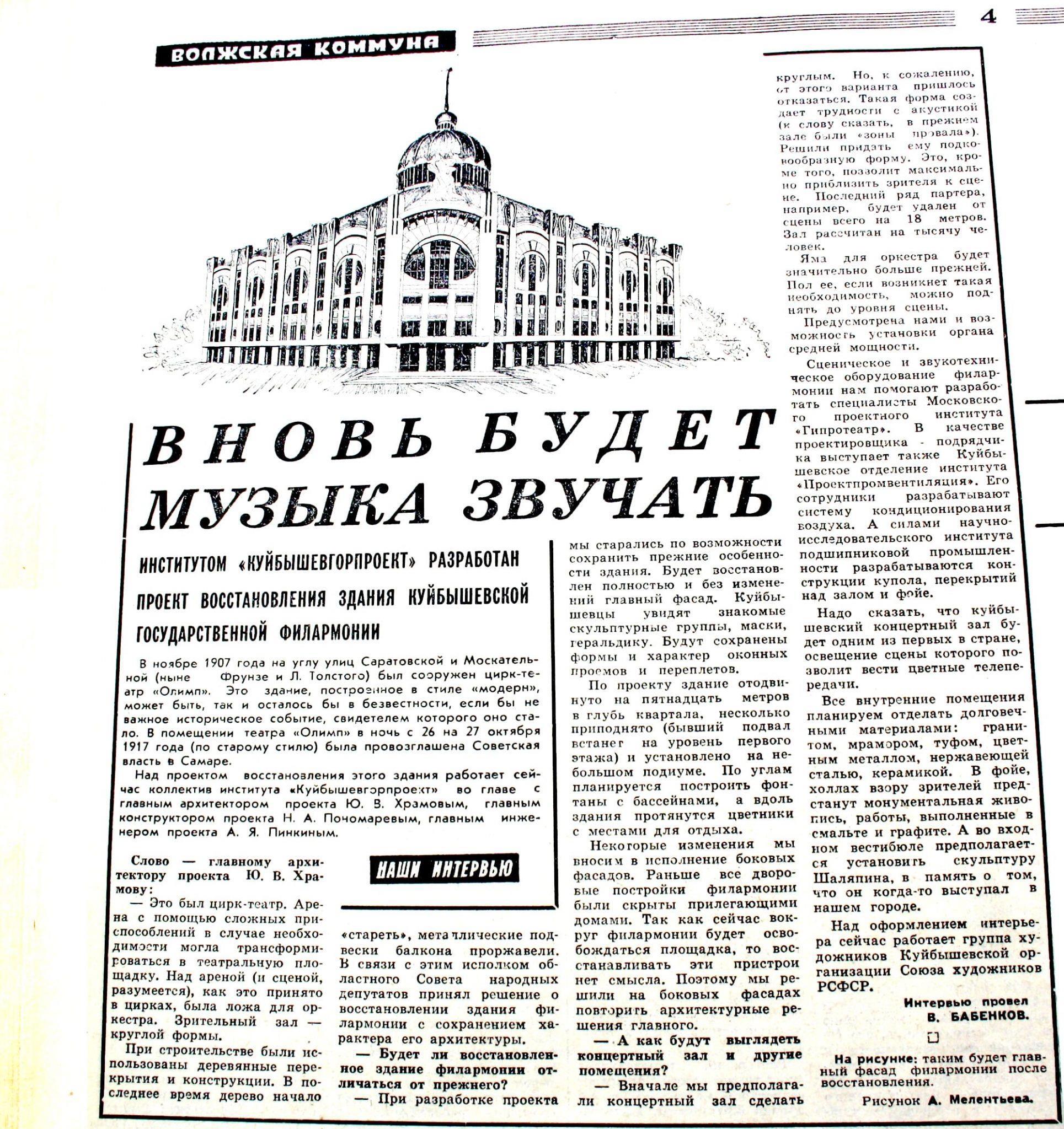 "26 октября 1917 года в театре-цирке «Олимп» была провозглашена Советская власть. В 1919 году «Олимп» был национализирован и переименован в театр имени Карла Маркса, в 1928 – 1934 годах здесь работал государственный цирк, в 1933 – 1935 годах краевой театр оперы и балета, а с 1940 года куйбышевская филармония.