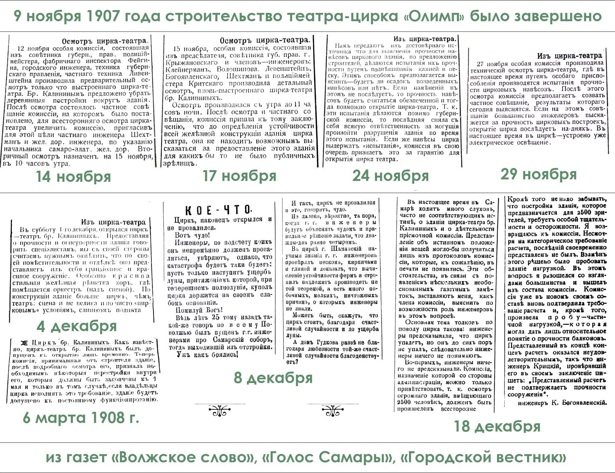 "Несмотря на то, что театр-цирк «Олимп» удивлял горожан и гостей своей красотой и уже открылся, в самарском обществе злые языки и некрепкие умы продолжали распространять слухи о том, что вот-вот, совсем скоро здание театра-цирка «Олимп» Калининых развалится, а купол непременно рухнет на зрителей. Театр-цирк «Олимп» работал, но был открыт «условно» и «временно».