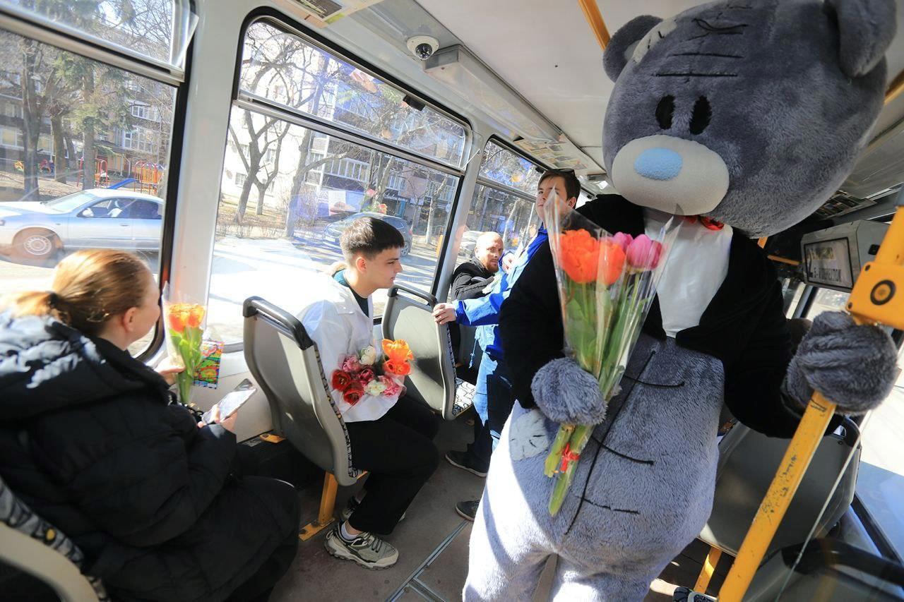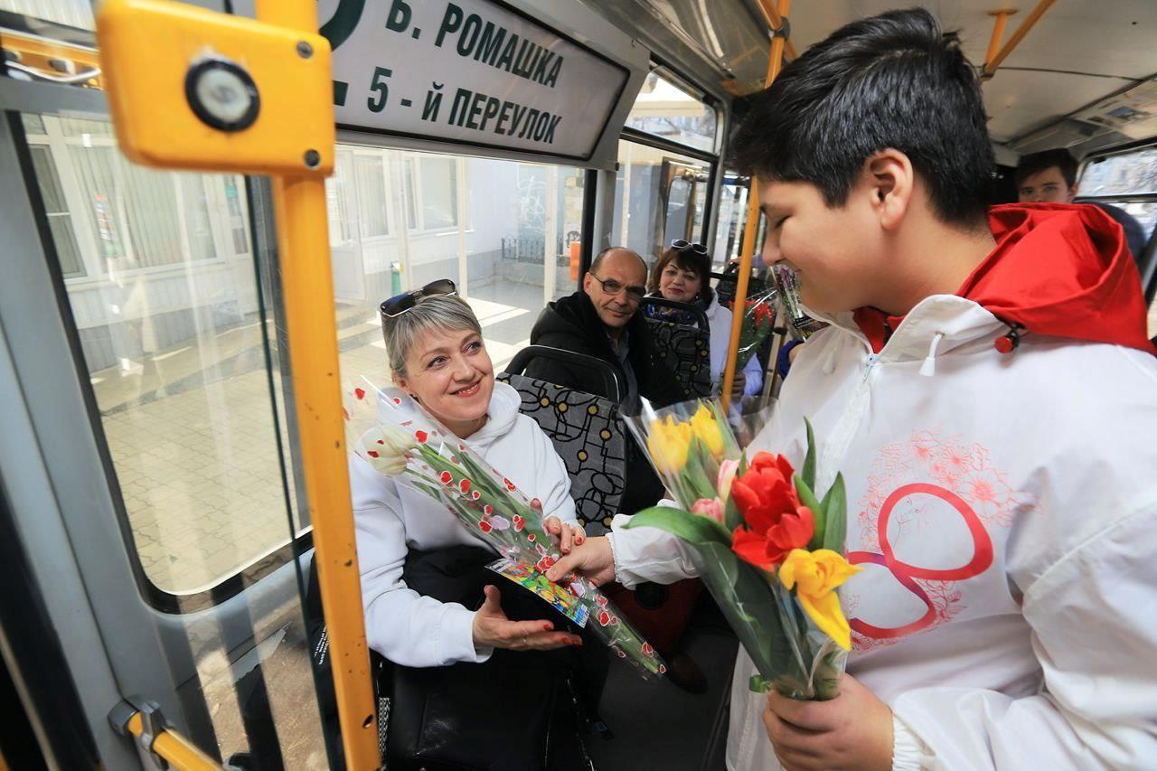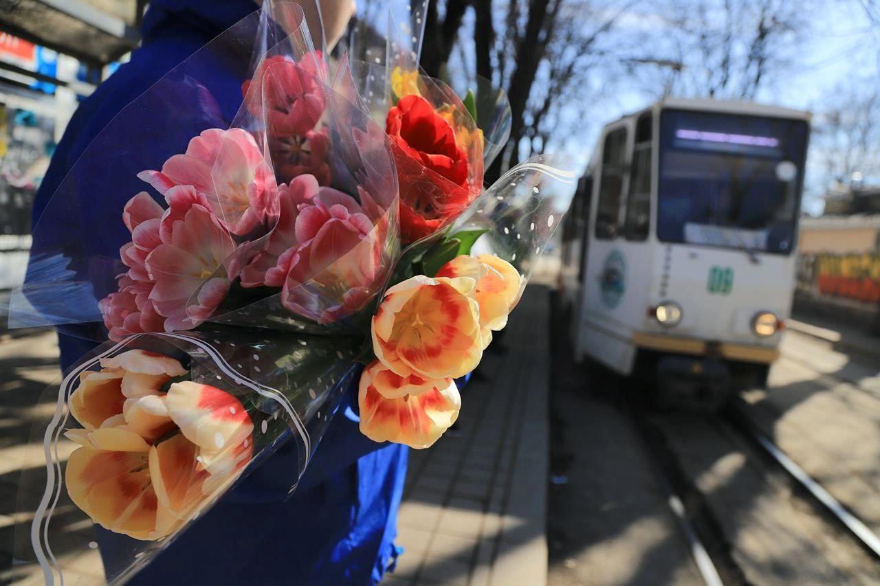 В городе в этот день работал "Цветочный трамвай". На остановках стояли волонтеры, заходили с цветами в трамвай и вручали женщинам. И было очень много счастливых глаз и улыбок!