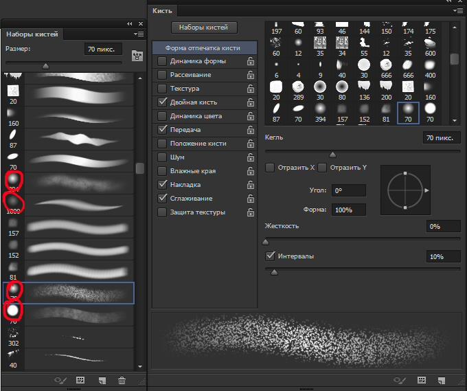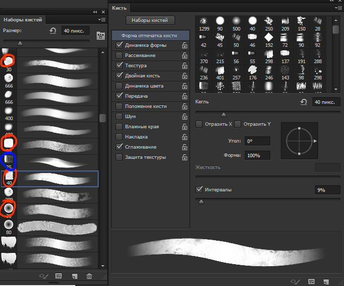 Рисую текстурными кистями, самая любимая квадратная, которой рисуется практически все, от окружения, до лиц) Только в конце использую текстурные круглые кисти для выравнивания и сглаживания переходов, в основном для кожи. Синеньким отмечена кисть которой рисуются мелкие прядки волос и отдельные волосинки.