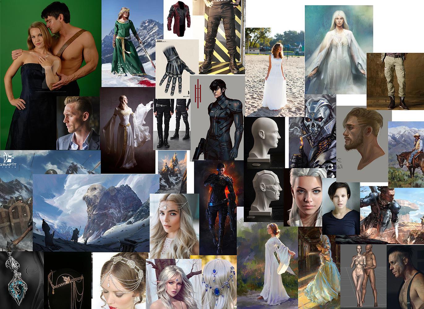 После того как заказчик прислал тз и я уточнила детали (А так же вытянула у него хоть какие-нибудь рефы), начинается собираться большая база референсов на арт. На позу, типы лиц, материалы, одежду, цвет, свет, окружение. В общих их очень и очень много. Не факт, что они все пригодятся, некоторые картинки взяты чисто для настроения. Для этого же подбирается плейлист. Так как когда я рисую, я полностью погружаюсь в процесс и окружаю себя всем, что этому способствует.