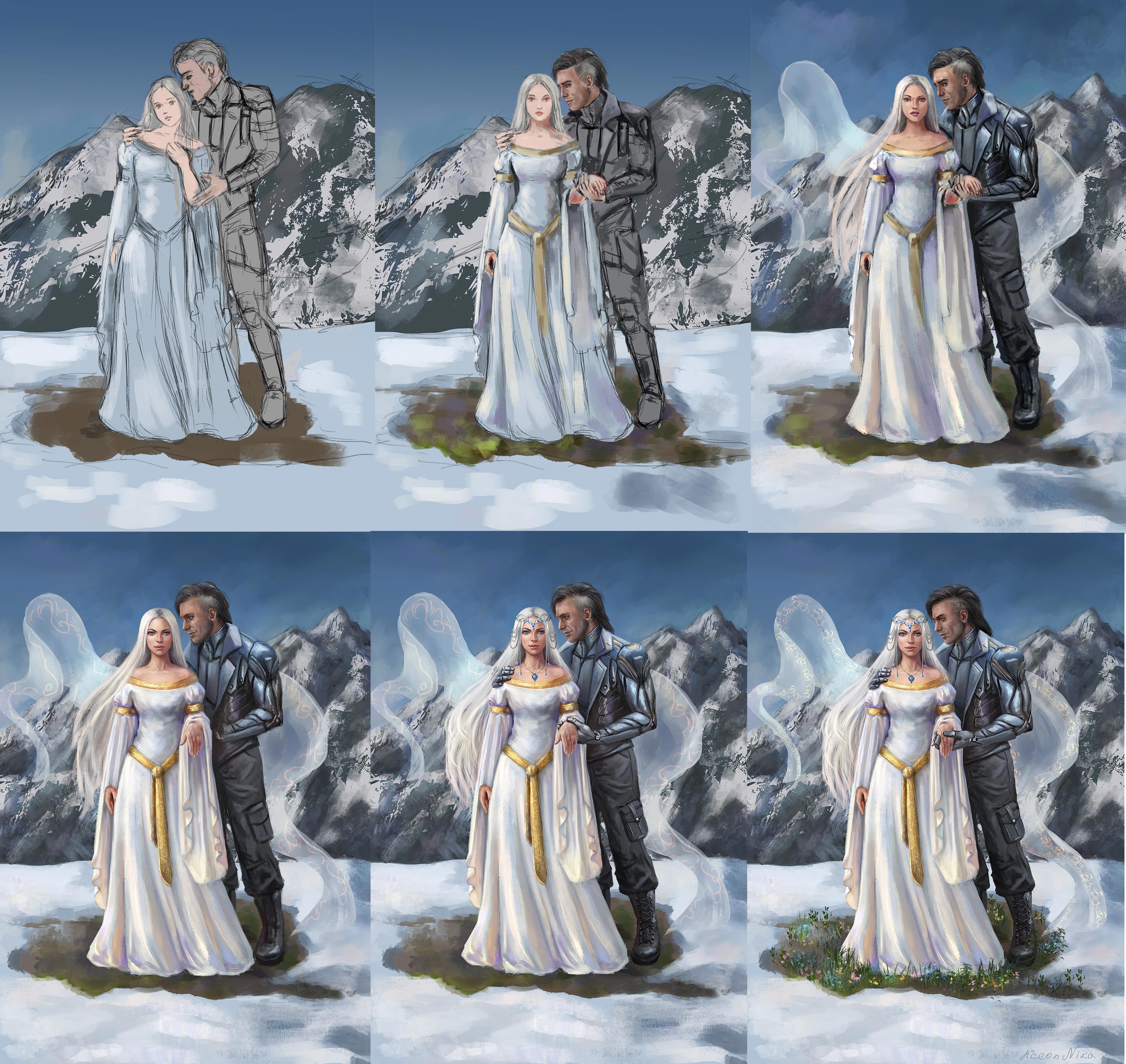 После того как я уточнила все детали у заказчика, я рисую первый набросок и отправляю ему. Уточняем позу, добавляем детали. В процессе работы я так же отправляю этапы, чтоб уточнить в правильном ли направлении я иду и если что изменить или добавить детали.
