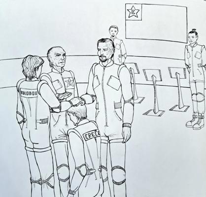Потом Лазаро надел ритуальную одежду — костюм-комбинезон, являющийся точной копией тех, которые носили в закрытых помещениях первые колонисты планеты.