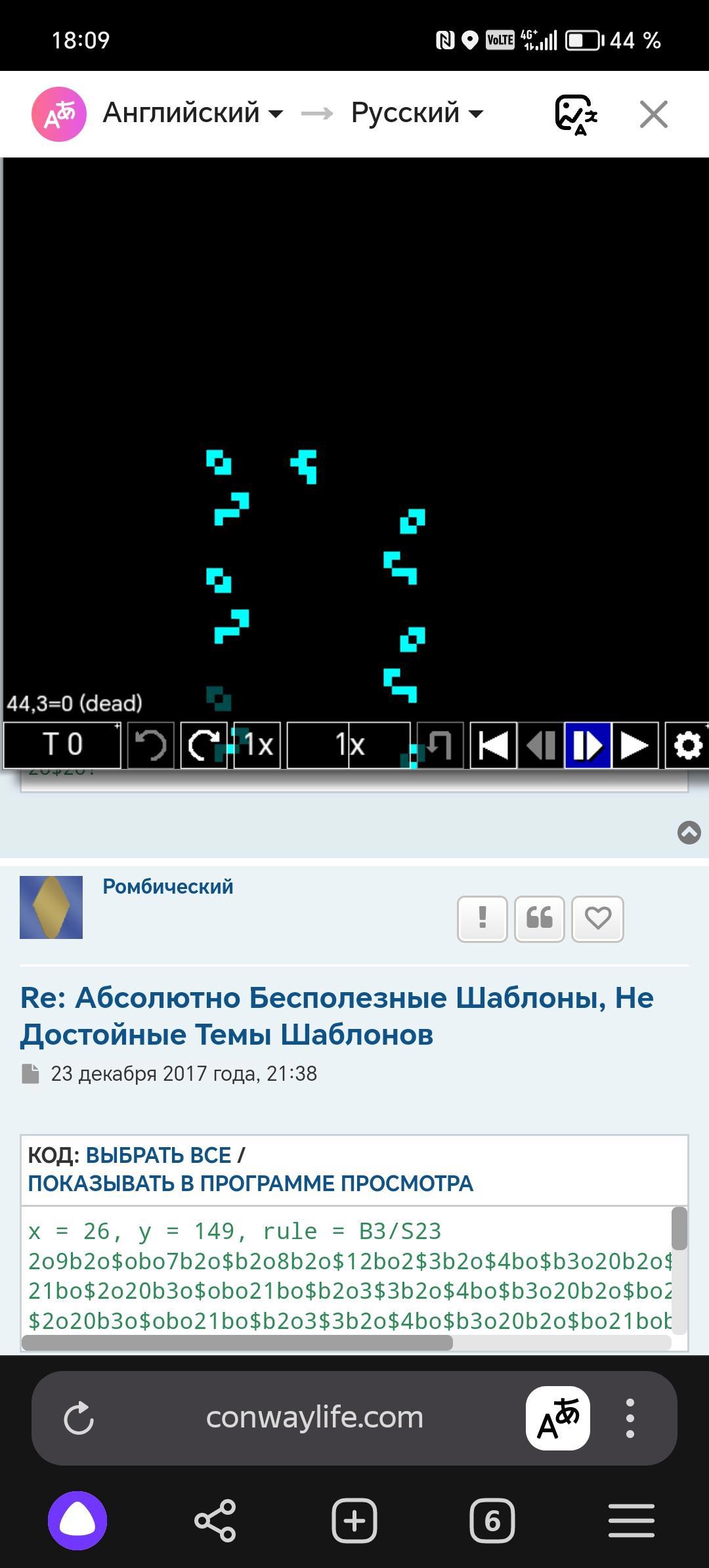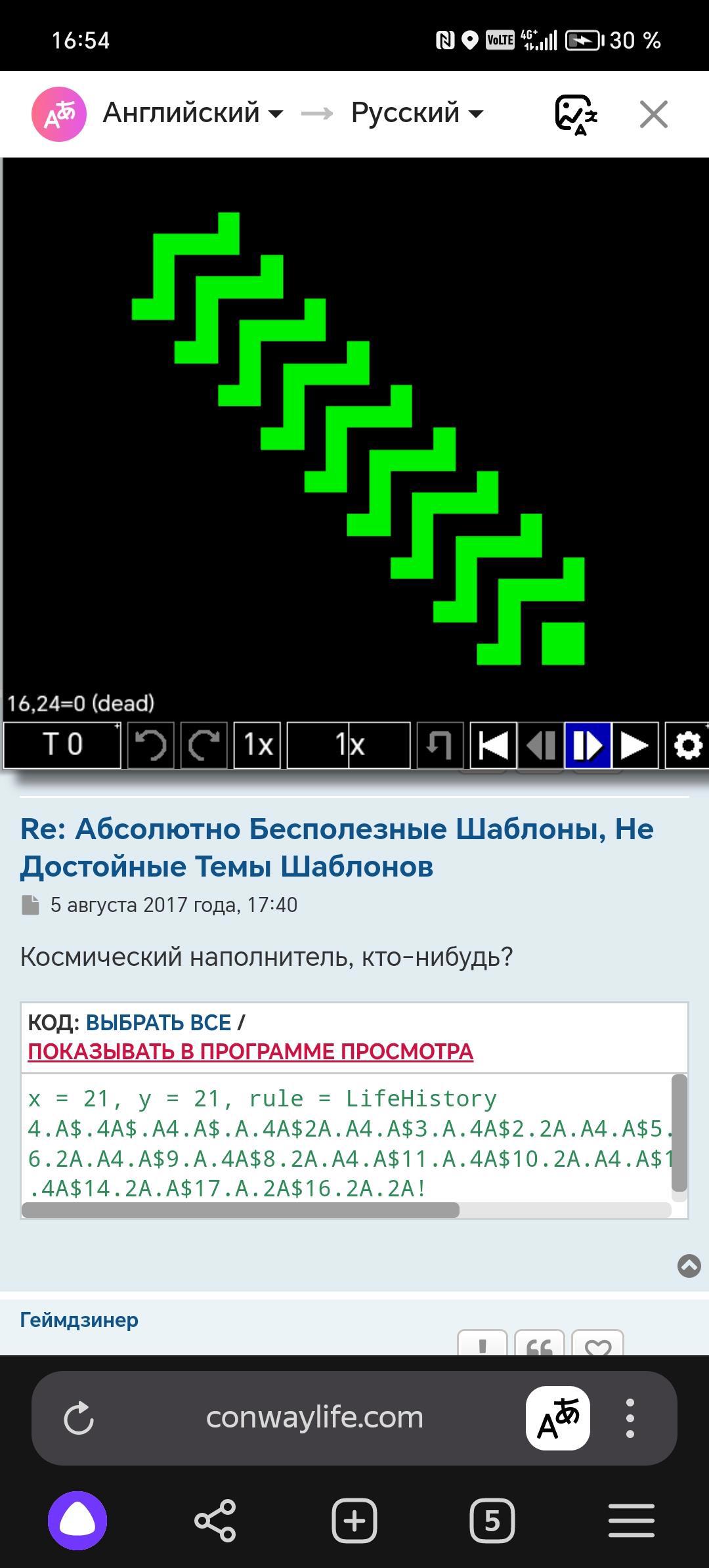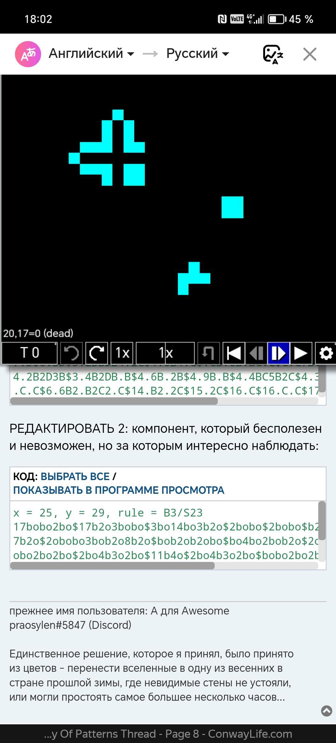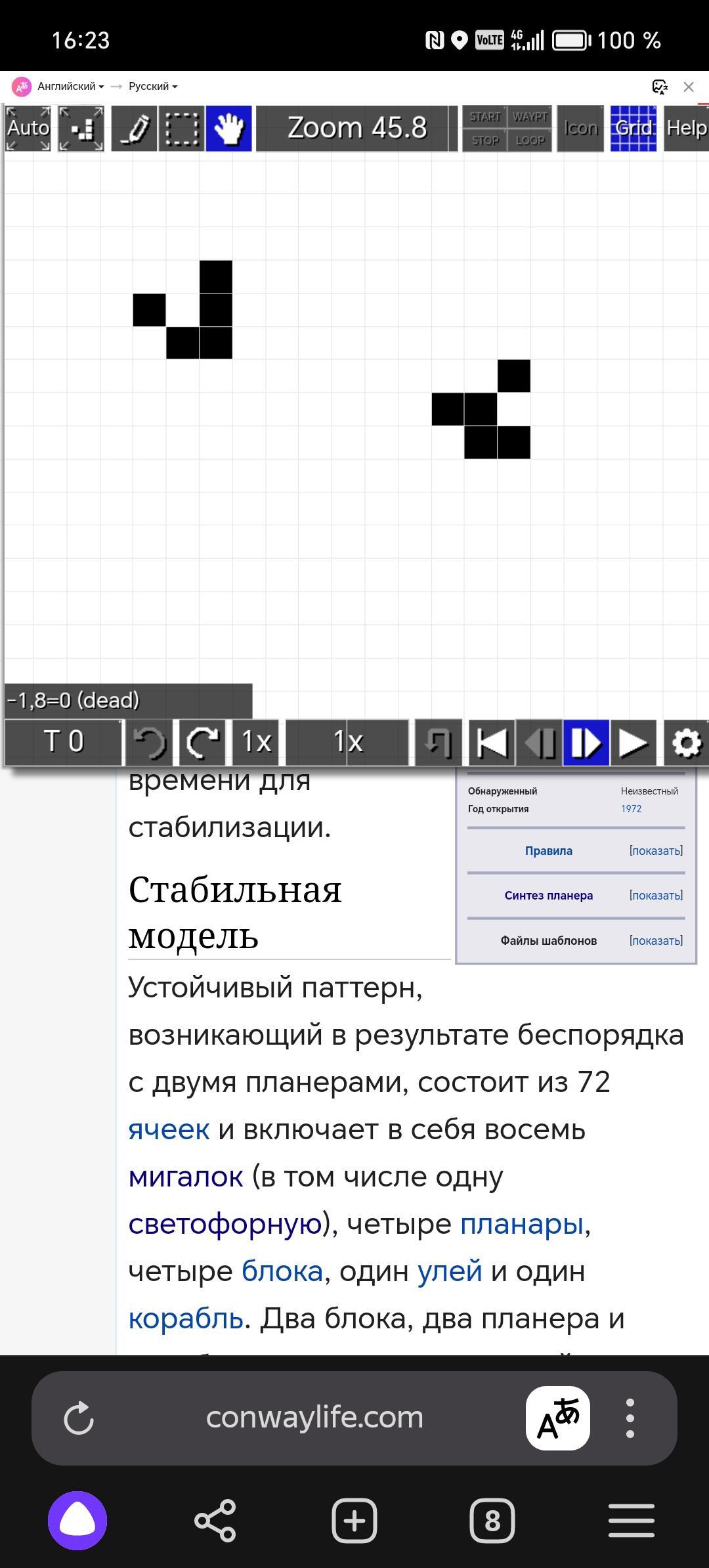 Сейчас будет куча фоток. Собрать их, коллекцию, в одну стартовую популяция сложно. Тем более сделать патерн - это значит заскринить стартовое и конечное расположение клеток. Напомню, что серединные состояния могут разветвлятся. Да! Одинаковые стартовые и конечные условия, а сценарий их многовариантный. В информатике и программировании это называется зацыкливание или цикл с Увеличивающеся ошибкой. Почему-то это называют ИИ или Нейросетью и отсылают к машине Тюринга. Хорошо что я в 90-ые в ПТУ ходил на программирование языком паскаль и... Тогда только Появлялся Турбопаскаль и... Язык програмирования добился на части, что бы услугу по его изучению можно было про довать подороже.