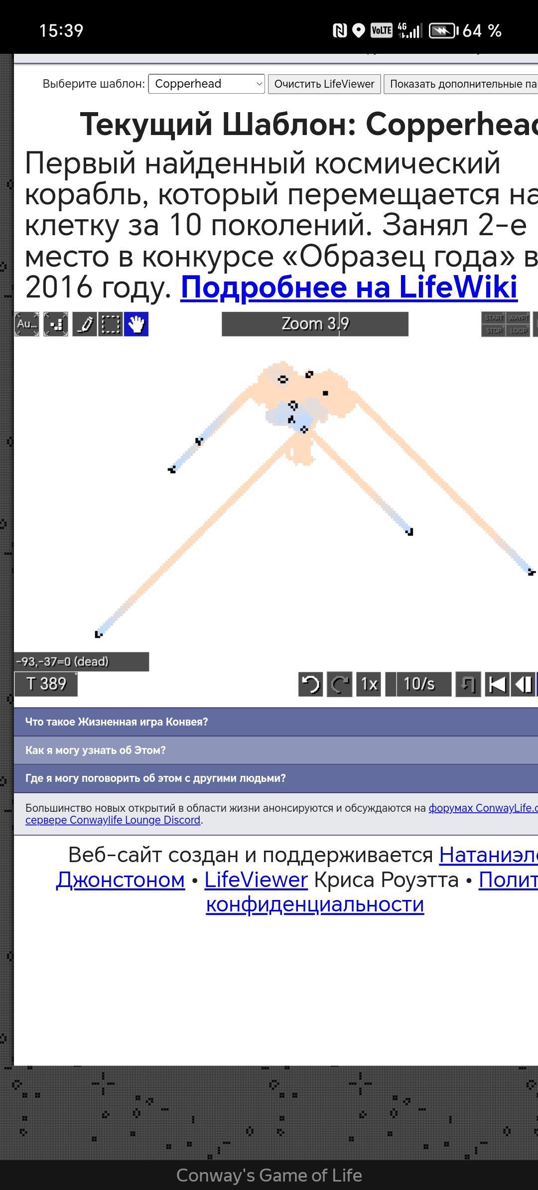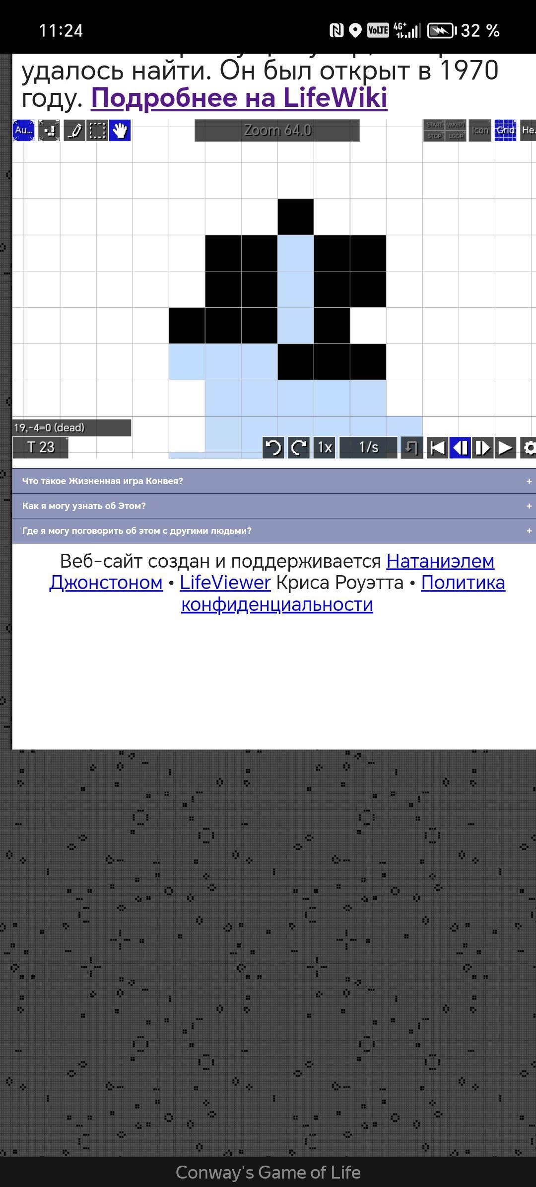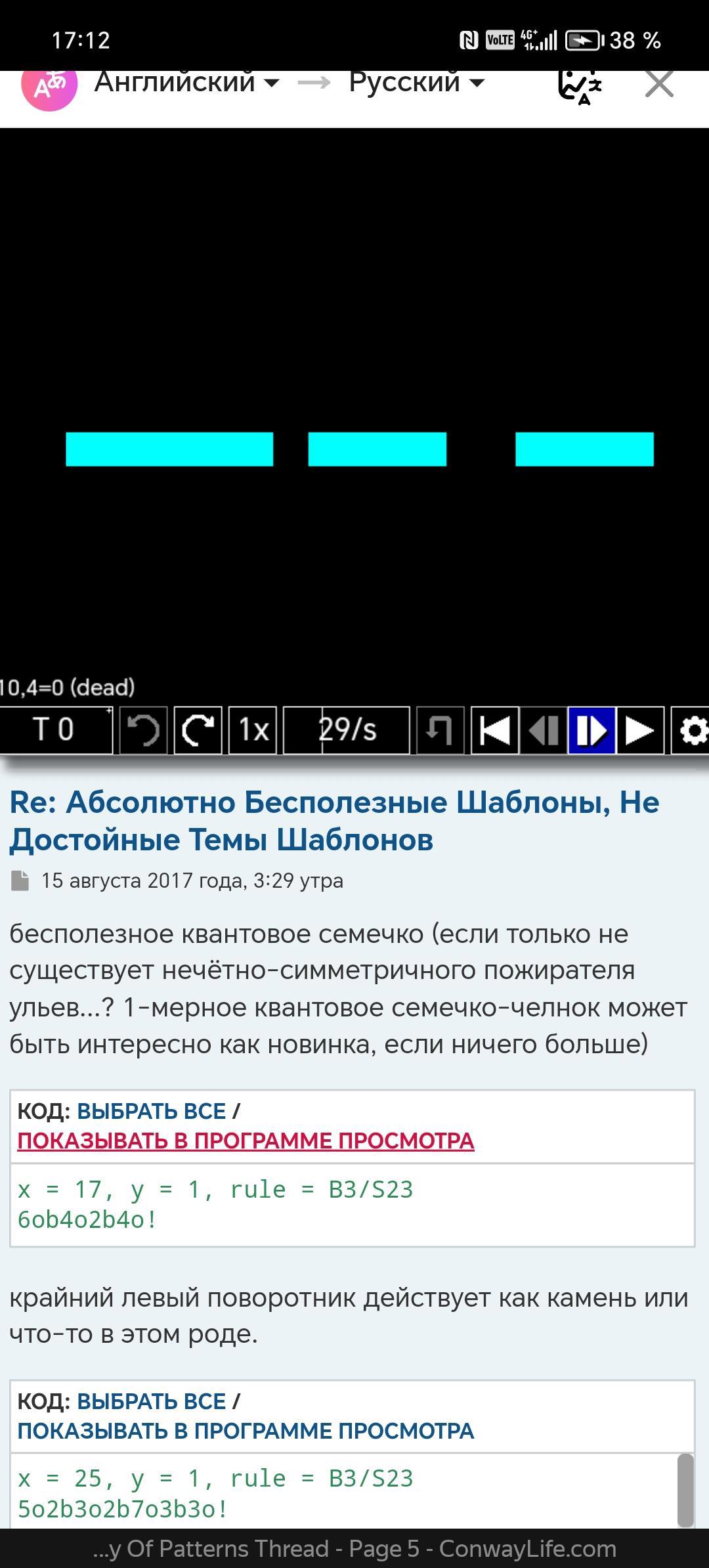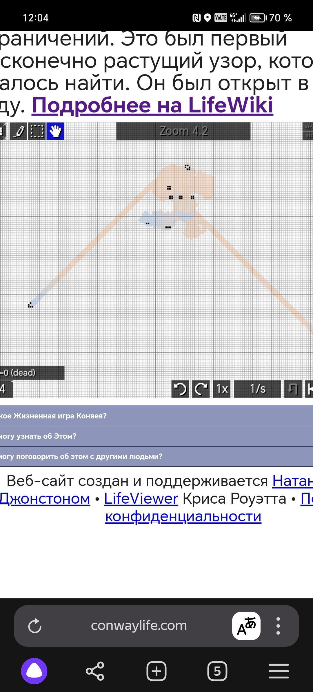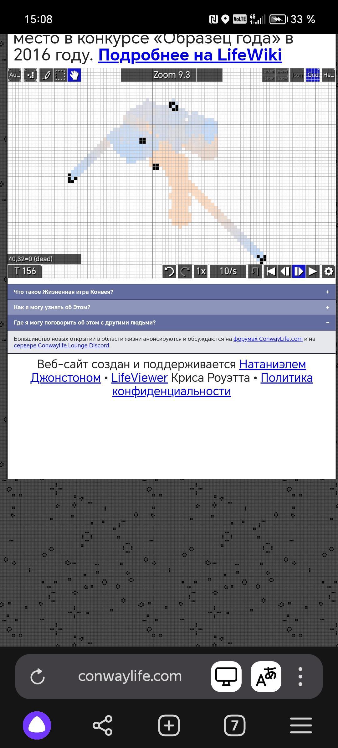 Сейчас будет куча фоток. Собрать их, коллекцию, в одну стартовую популяция сложно. Тем более сделать патерн - это значит заскринить стартовое и конечное расположение клеток. Напомню, что серединные состояния могут разветвлятся. Да! Одинаковые стартовые и конечные условия, а сценарий их многовариантный. В информатике и программировании это называется зацыкливание или цикл с Увеличивающеся ошибкой. Почему-то это называют ИИ или Нейросетью и отсылают к машине Тюринга. Хорошо что я в 90-ые в ПТУ ходил на программирование языком паскаль и... Тогда только Появлялся Турбопаскаль и... Язык програмирования добился на части, что бы услугу по его изучению можно было про довать подороже.