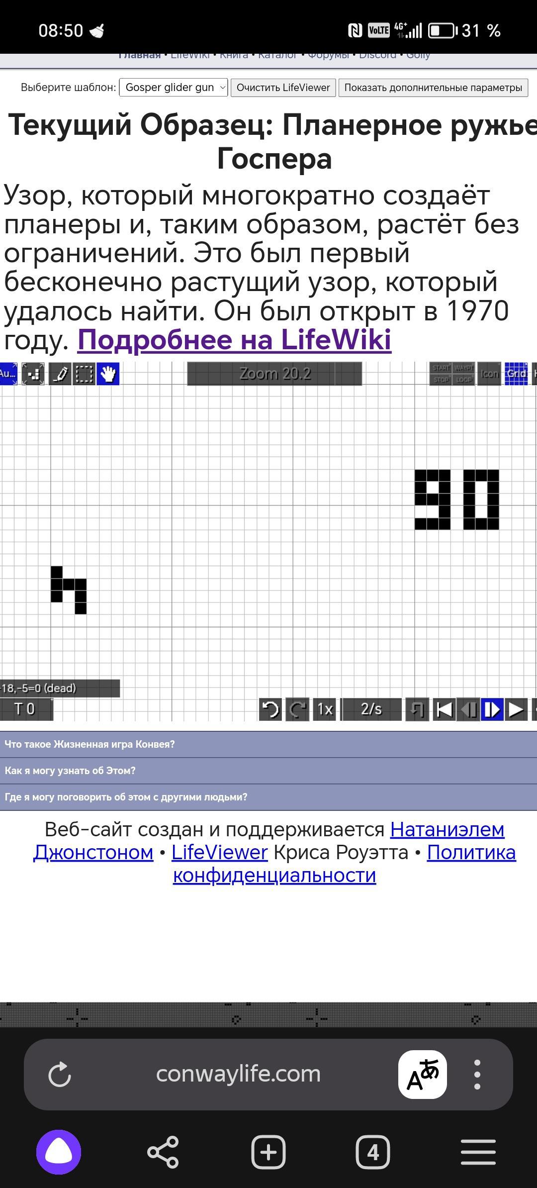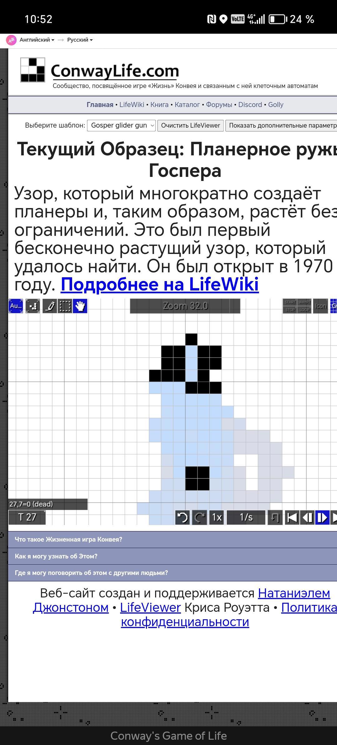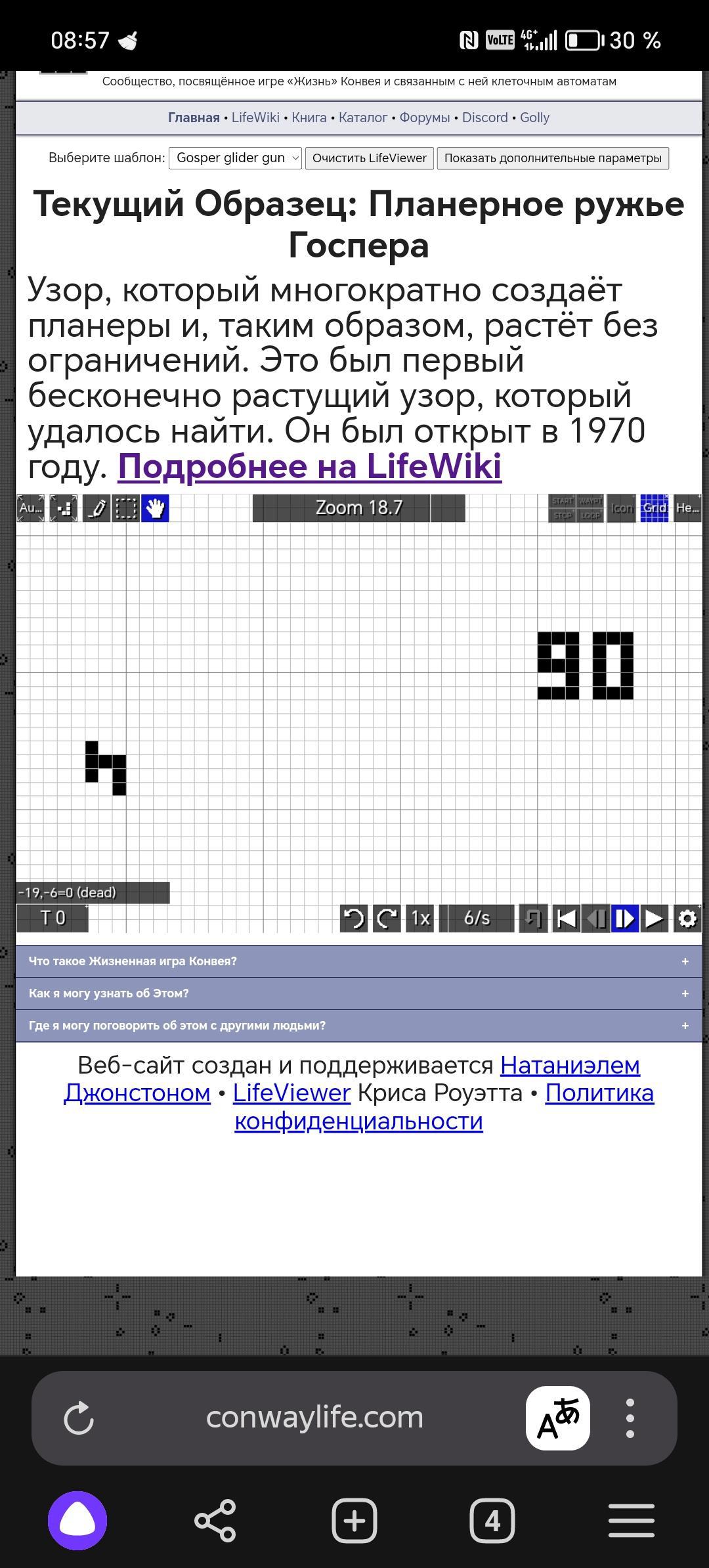 И главное я в игре Жизнь конвея нашол твёрдый и мягкий знак. Жаль буквы Ы не нашлось в МДЖ. Но, зато пополнилась моя коллекция Патерна. И Нейросеть под сказало отличие патерна от итерации. Патерн это состояние клеточного автомата, может быть не единичные. От стартового до конечного состояния колонии. Единичный набор! А итерации - это алгоритм пересчёта между смены поколениями.