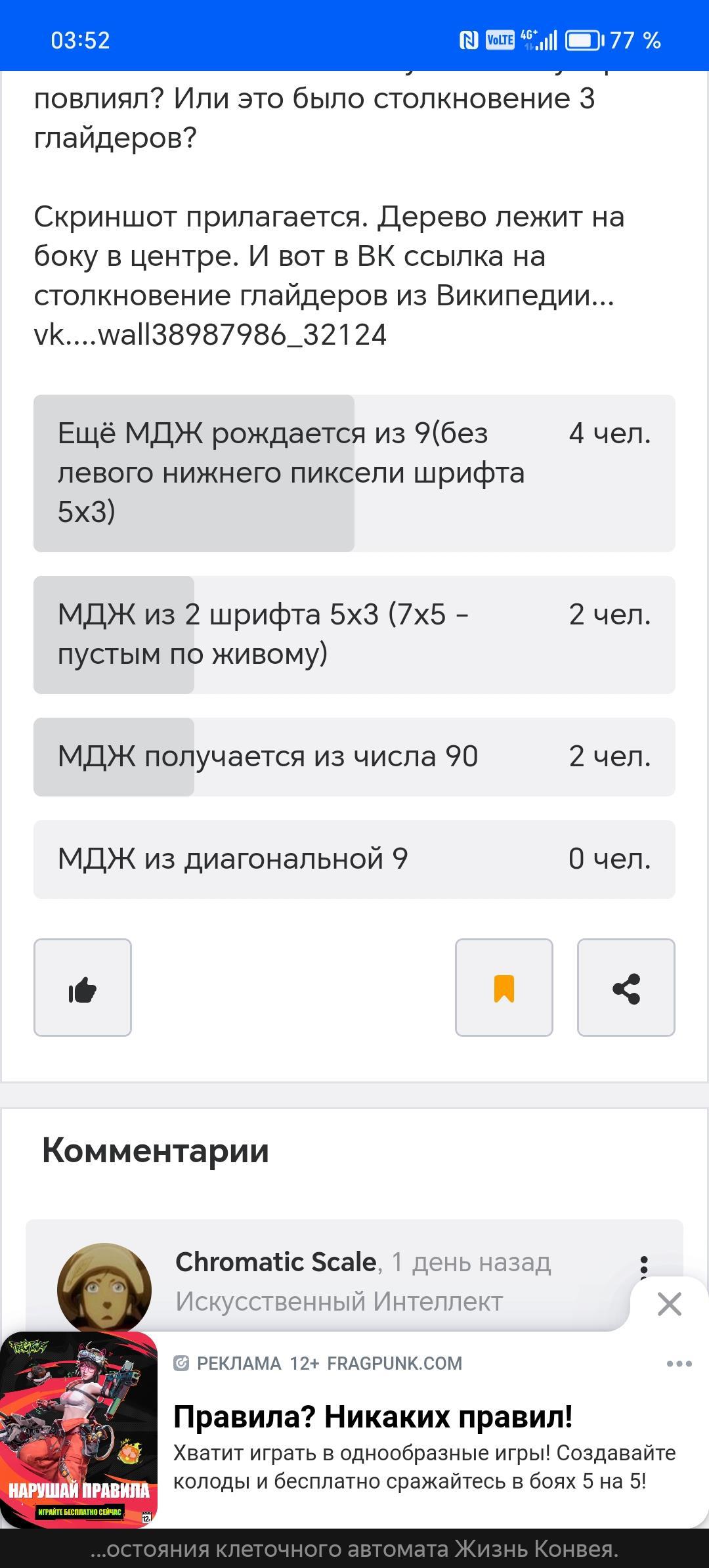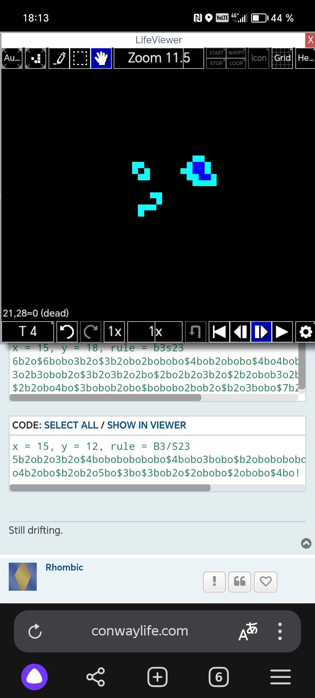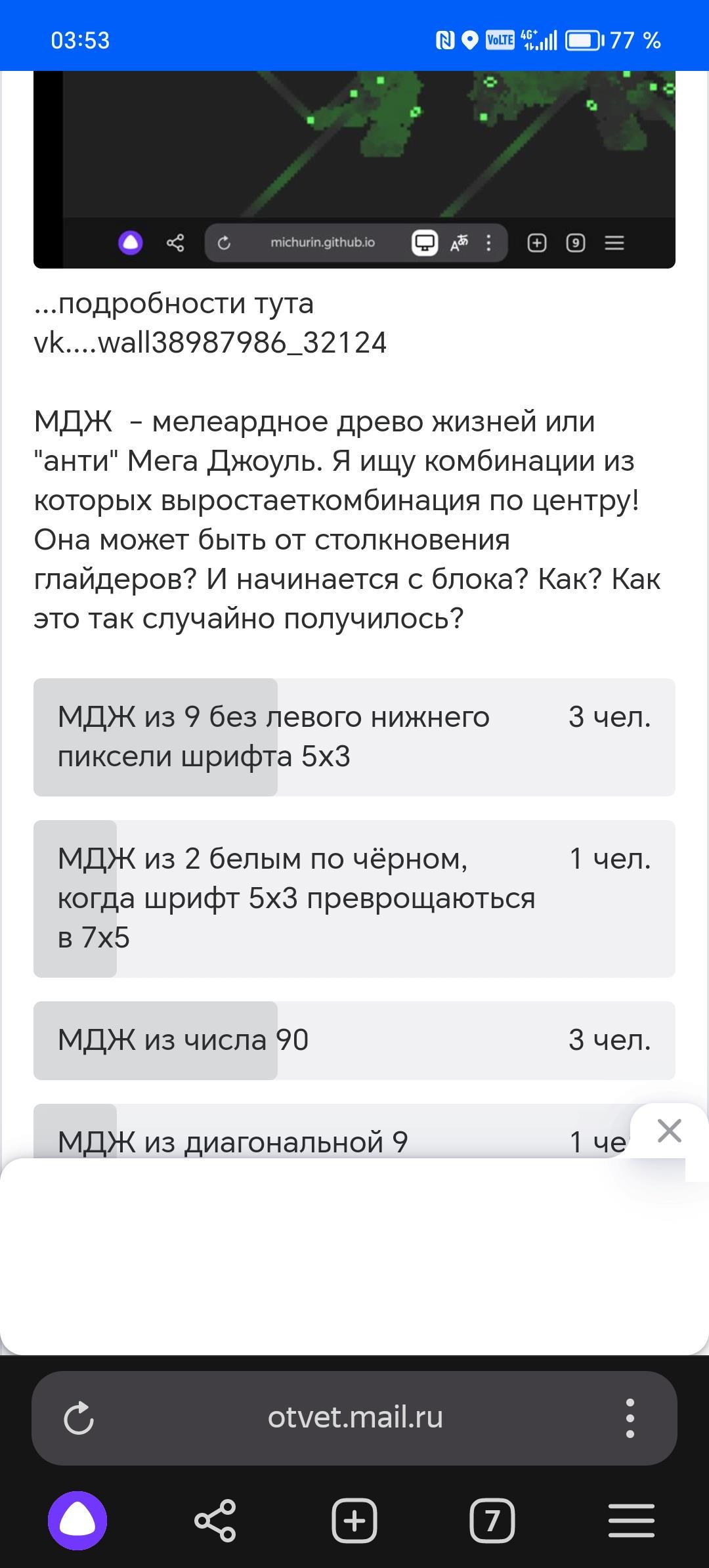 Да, эволюция! Это второе название игры Жизнь Конвея. Я на форум вики-жизни ели зарегестаровался. Капчу ели прошёл. Нужно было без грамматических ошибок слова на английском написать. Но я справился. И стартовую коллекция Семецветных семя МДЖ-тюльпанов Трезвости там опубликовал. Правдо меея хвотило всего на 10 страниц форума. Но пролистав их обноружил пополнение своей коллекции. Я ищу простые стартовые комбинации для Дерева с двумя глайдерами, блоками и цветочком(не помню название). Там оказалось... Их много. Но главное пополнение коллекции - это МДЖ.ч4ч. Очень похож на МДЖ-куст, потому что "2-а и 9-и" моей стартовой компании... Содержал в себе это четвёрку. И...
