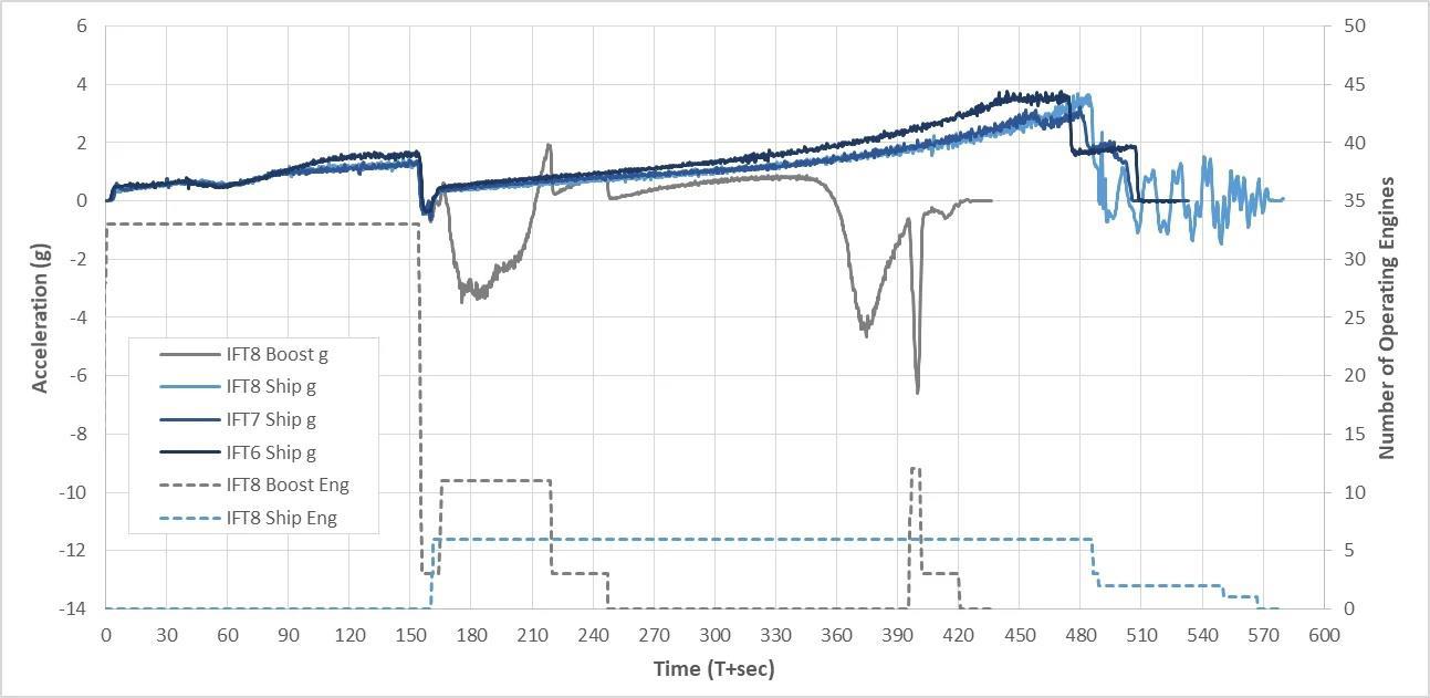 Как видно из графиков, Старшип-2 разгоняется медленней первого. При этом ITF-8 достиг того же ускорения при котором ITF-6 делал его постоянным перед тем как отключить вакуумные Рапторы.
