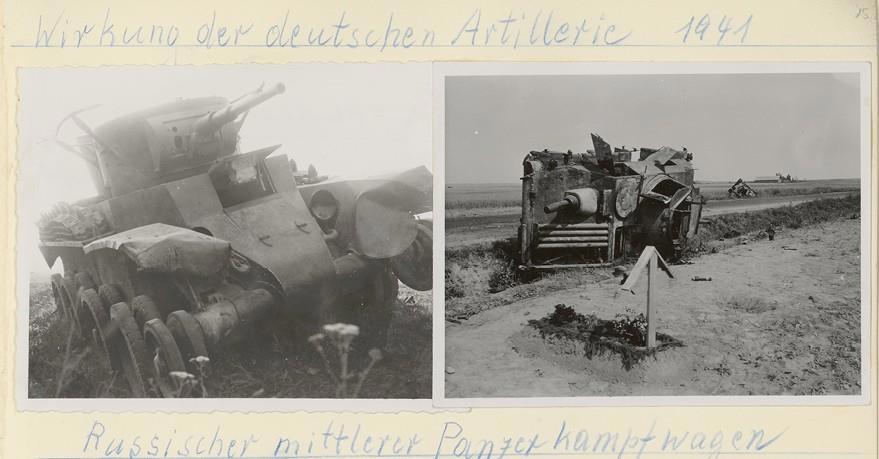 Подписи. Вверху - действие немецкой артиллерии 1941. Внизу Русский средний танк.