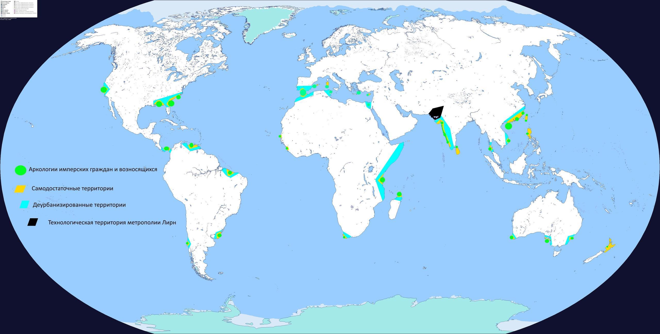 При индустриальной технологии высокая эффективность обработки земли с механизацией и удобрениями снижает эти требования, а на смену открытому выпасу приходят птицефабрики и другие похожие организации. Значительная часть земель сельскохозяйственного назначения по нему больше не используются. По мере того, как в нашу жизнь входят дроны, необходимость проживания людей в деревне снижается, а есть еще такие страшные слова, как гидропоника и аквакультура, которые дополнительно сокращают требования к занимаемой площади. Закрашенных бирюзовым территорий вполне хватит, чтобы жители аркологий сытно кушали.