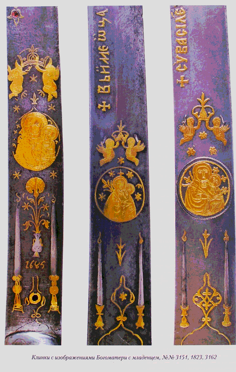 - Существует примеры клинков, где Богоматерь «Неувядаемый цвет» изображена с ангелами, держащими корону над её головой. Чаще всего подобные мотивы находят на саблях из Греции.