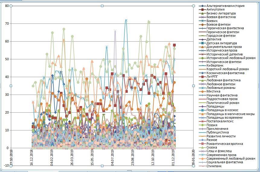 Итак, количество произведений по жанрам по неделям выглядит так: