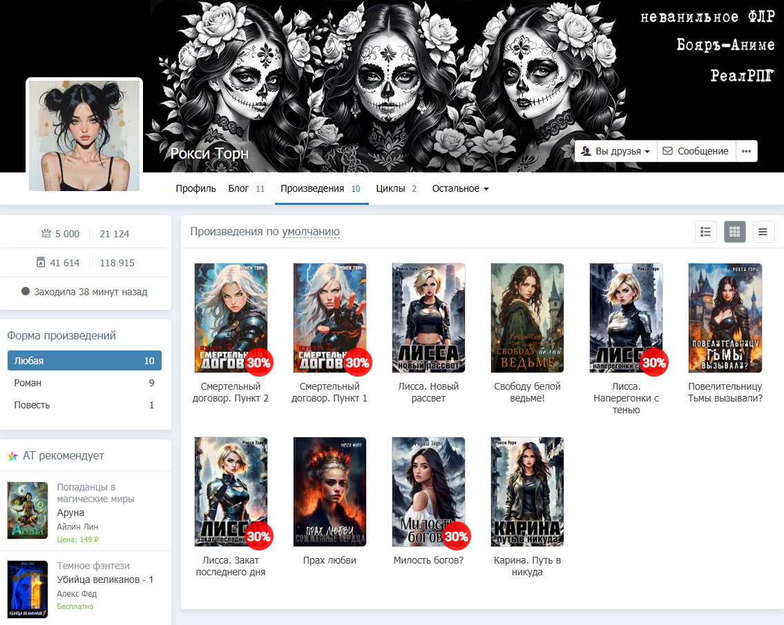 Ссылка для всех заинтересованных: https://author.today/u/roxiethorn/works?view=list&sorting=default
